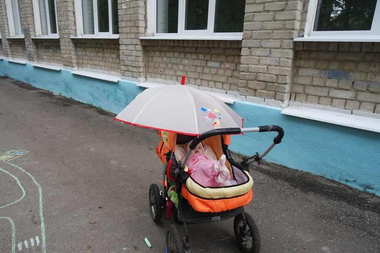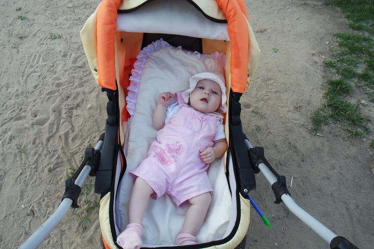 Я, как и Анюта, могла часами кататься на качели и наблюдать как плывут облака! Аня может долго кататься в коляске.