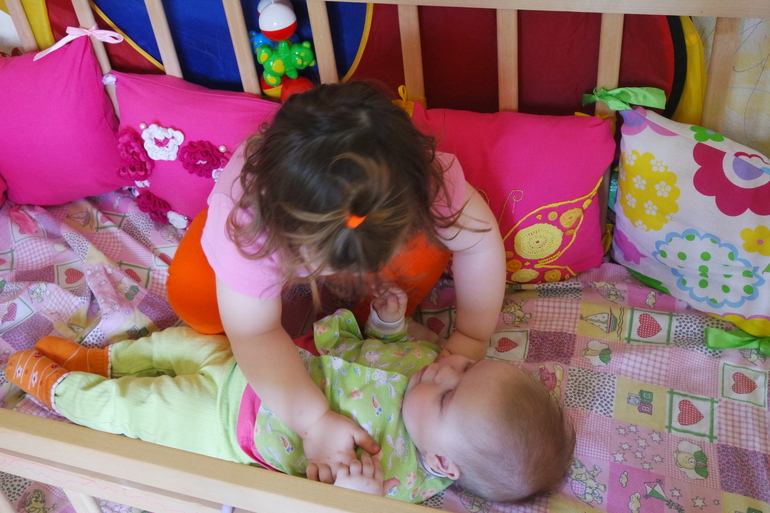 А еще девчонки любят прятки. Очень смешно прячутся))) Анюта под тряпочкой, а у Лизы ножки торчат) Когда Лиза ищет сестру или папу, она сразу замечает кто где спрятался, но продолжает везде заглядывать "здесь нет, папа ты где?")))