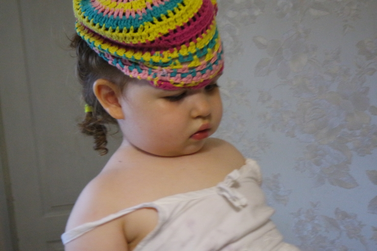 Одевает летние шапочки. Если одела, значит ее пора вести на прогулку))) Злилась, что Людочкина шапка не лезит.))