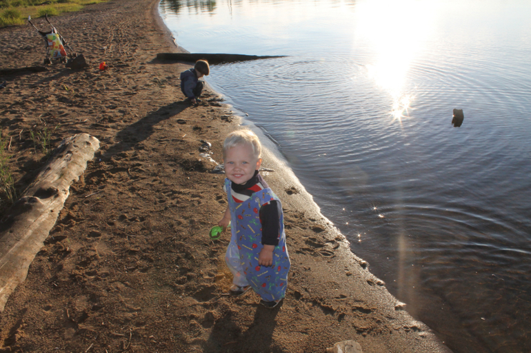 Будила десять минут. Встаёт. Протирает глаза. Не капризничает. Получает печеньку в зубы и инструкцию смотреть в окно - там будет железнодорожный переезд, шлагбаум, и почти сразу вокзал... Одеваю спящего Митю. Раскладываю коляску, сажаю его туда. Мне помогает добрая пассажирка - один фиг с нашей вознёй не уснёшь. Стоянка в Кондопоге очень короткая, нужно оперативно десантироваться. Удалось, ура! Митя проснулся, ну ничего.