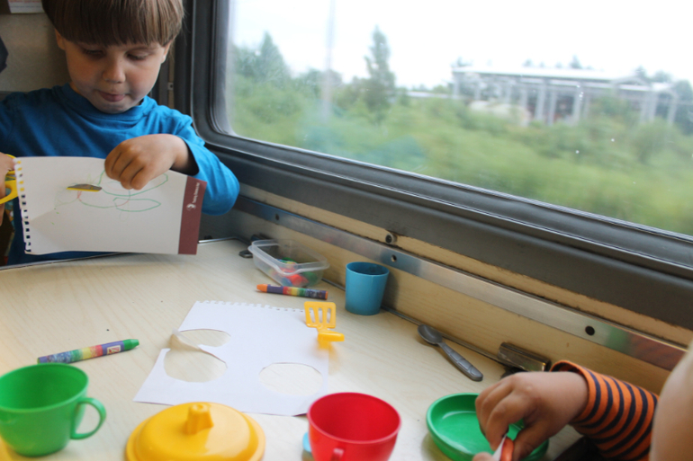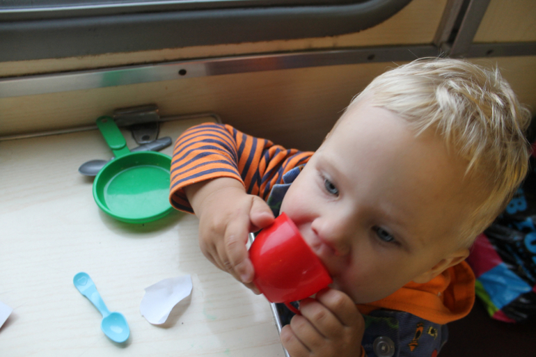 Отправление в 22.40, Митя устал и канючил спать, а свет всё не выключали... Серёга очень удивился обычным, не боковым местам: "А почему тут сидений нет, одни кровати?" Мне, кстати, на боковушках тоже больше понравилось: там хоть ребята не стукаются головой об стол, когда ползают по постели... Опять пытка едой: нам на ночь есть нельзя, а в соседнем купе, как сообщает мне Серёжа "уже достали еду и положили на стол. У нас тоже есть стол, и нам надо покушать". Ага. В одиннадцать-то вечера.