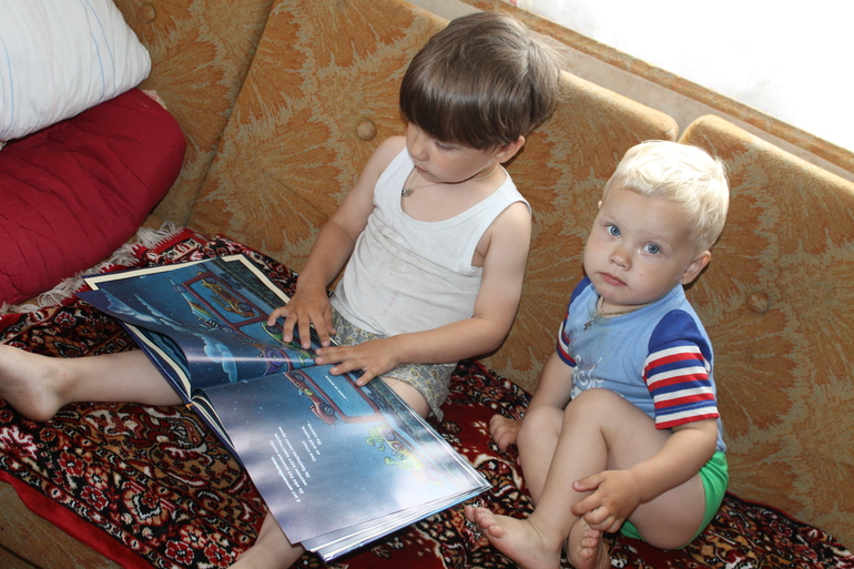 Рассуждаем о том, кому бы могла пригодиться малышовая книжка, если она уже неинтересна Мите. Одна из версий - вдруг у нас когда-нибудь появится ещё малыш (чисто гипотетическое предположение, не имеющее сейчас никаких материальных оснований, если чё). Серёжа задумывается, потом возмущается: