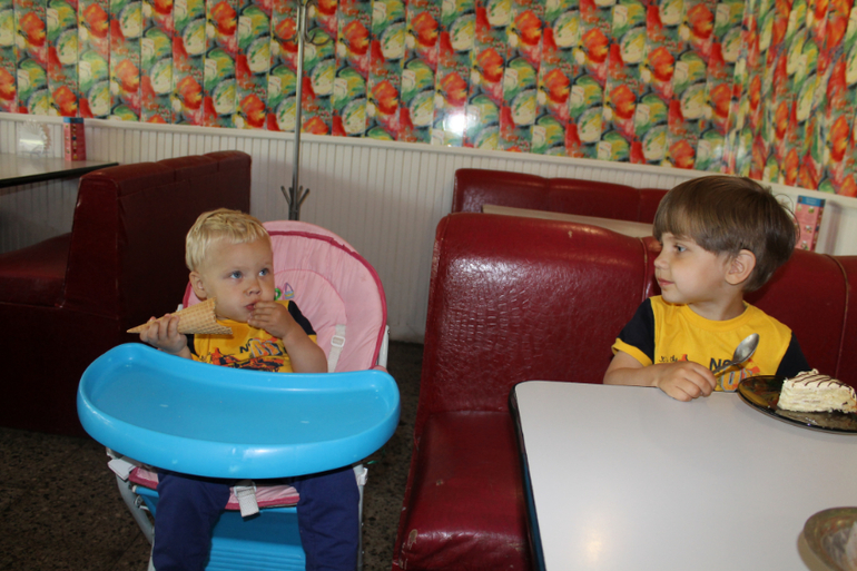 В субботу пошли в кафе - поесть мороженого. Серёге заказала порцию, себе двойную, а Мите пирожное. Этот козявка не стал его есть, просто ходил и передвигал стулья, потом обнаружил детское креслице, потребовал сесть туда и возжелал печенья. Тут меня осенило: купила ему вафельный конус, но без мороженого. Счастье есть! Серёга такой же захотел, несмотря на съеденное мороженое и половину пирожного...