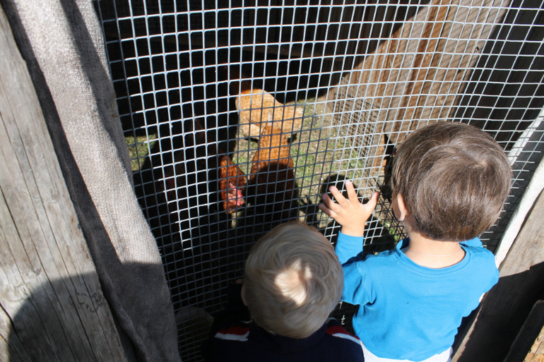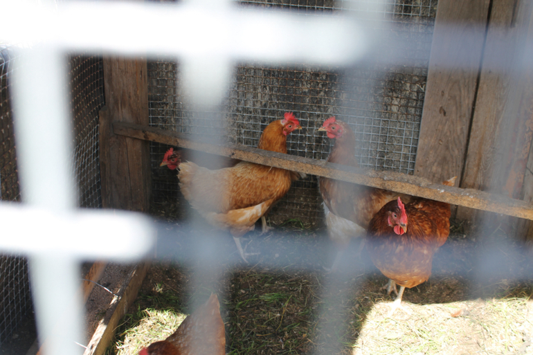Да, здесь есть курочки. Аж пять штук. Сначала Серёжа на них просто смотрел, потом «кормил» опилками, потом настоящей едой - рвал листья одуванчика и травку, собирал для них улиток… Учил летать - просовывал через сетку листочки, но высоко, так что курицам нужно было подпрыгнуть, чтобы схватить листок…