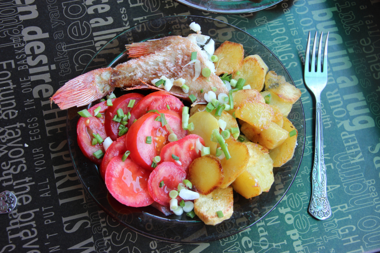 с картошечкой;) , и много еще разной рыбки. Семга была наисвежайшая, всего 650руб за 1кг! Цены в Крыму демократичные, по-сравнению с Краснодаром даже в чем-то дешевые, к примеру хлеб 15руб, у нас 23 (видимо Крым теперь "житница России"))), творог 130руб 9%, у нас - 230руб и т.п.)