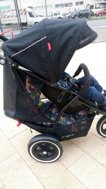 а у нас прогулочная коляска для погодок/двойни Joovy Caboose, удобная очень, коляска компактная и маневренная. Заднее сидение предназначено для детей от 2,5 лет, а переднее от 3 месяцев. Колеса прочные и ход мягкий, еще есть универсальный адаптер, который позволяет установить автокресло на переднее сидение 0+