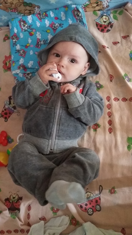 Ванюше завтра 6 месяцев. Крупный котенок)) радует меня,как всегда смеется. Вес сейчас 7900,рост 70. Начну на днях прикорм,сынок проявляет недюжинный пищевой интерес. На днях отобрал у брата кусок хлеба и чуть не засунул в рот,тянется и открывает рот,когда папа с ним на руках ест. Не сидит,но мы в понедельник начали присаживать в подушки.надо учить его сидеть,он перестал помещаться в нашем филе в нише...лежит с согнутыми ножками и психует. Резво передвигается,лежа на животе. В выходные упал с нашей кровати,когда папа понес качели на кухню,но все обошлось. Вообще становится все легче и легче.