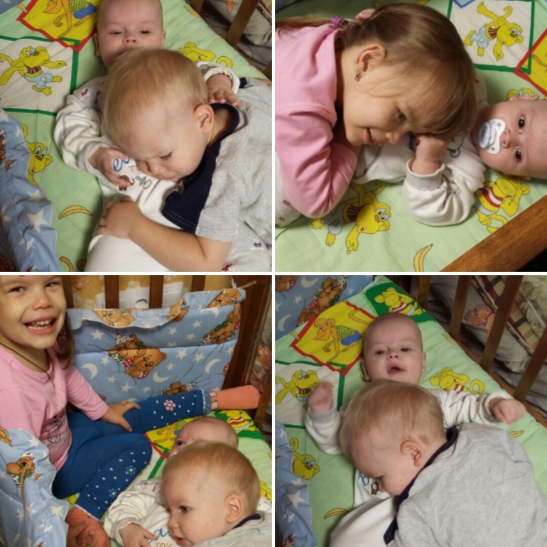 А Митя нашел способ доводить сестру.когда кладу на дневной или ночной сон,он шепотом ей говорит:"Ти не папа!Ти неее мама!" ( у тебя нет папы!у тебя нет мамы!) Она ревет,прибегает жаловаться!ругаем Митю,объясняем Манюне,что у всех мама и папа. Но Дима продолжает... драк стало в разы меньше. Мои упорные обучения обмену и договорам работают.Часто слышу Машино:"Я те,я те!"( я это,тебе это). Еще прошли дочины страхи -перестала бояться собак,машин и спать в комнате без родителей.