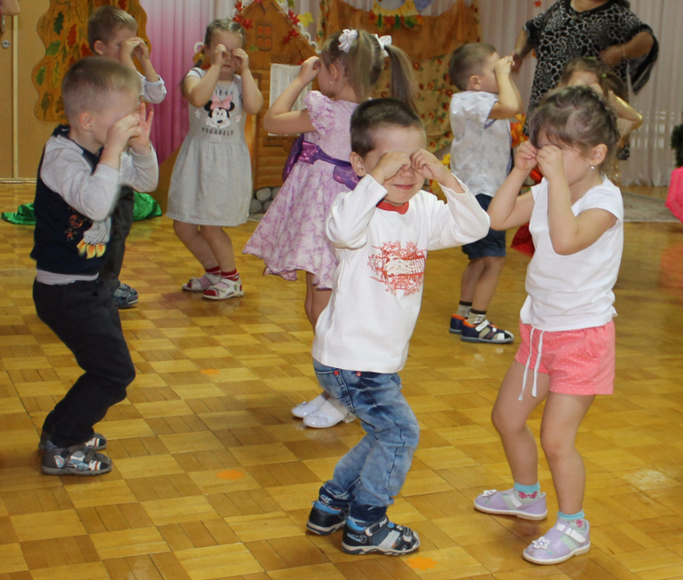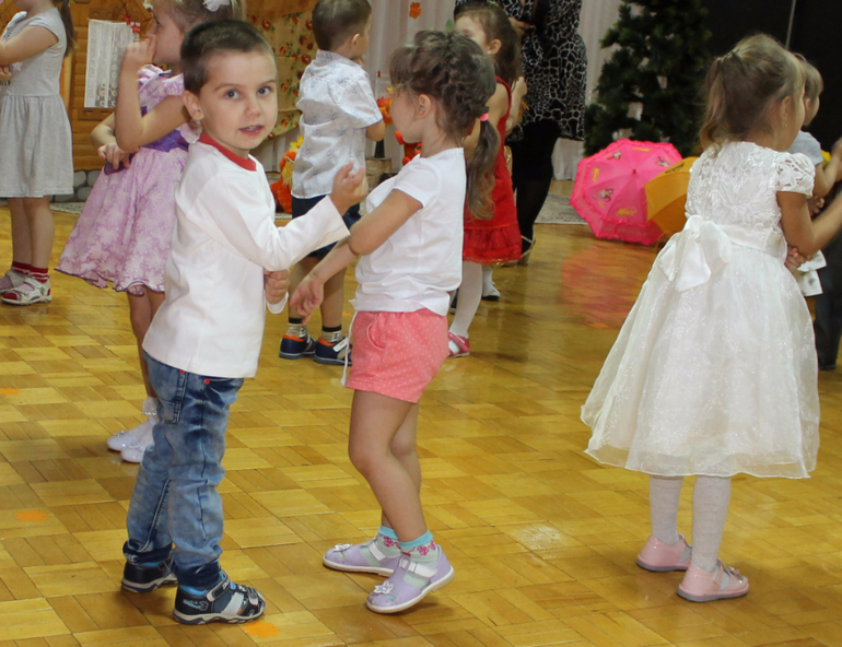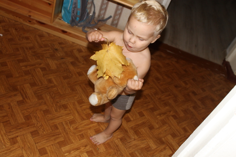 Вера был праздник осени. Конечно, мой не выступал, только в массовых номерах постоял - рот пооткрывал, в колокольчик не вовремя позвенел... Если все идут кругом, Серёга создаёт пробки - медленно, смотрит по сторонам, всё разглядывает. А то и в носу поковыряется. Рожи сам себе корчит - то глаза зажмурит, то округлит и нижние веки пальцами оттянет. Половину танца в паре хорошо, половину простоял... Ну, в своём репертуаре и на своей волне ребёнок. Я ещё неправильно сделала - села поближе, так он всё ко мне оборачивался и разговаривал... Пришла его переодевать первая, чем ввела в радостный шок: весь вечер, и после садика, посреди любого разговора, вдруг вспоминал: "А ты первая ко мне сегодня пришла!" Много ли человечку для счастья надо...