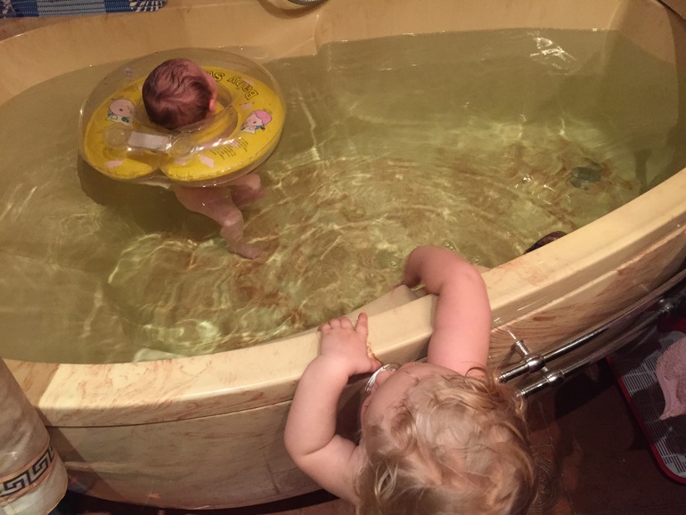Из того, что бесит. Это ситуация с Алисой и совместным санузлом:( У нас там еще 2 лотка для двух котов и их две миски для еды, ну и ее любимый унитаз естественно. С момента как Алиса поползла по дому, миски котов удачно перекочевали из кухни в туалет. И дверь в туалет стала всегда закрыта, а коты как-то сами по себе научились проситься в туалет - сесть у двери и помявкать. Промахов, слава котам, пока не было. В туалет Алиса со мной не ходит за редким исключением... :( Все усложняется наличием мисок и лотков. Какое там расслабиться в интимной атмосфере туалета... Помыться вообще не реально. И именно из-за того, что санузел совмещен. Если Алису пустить пока я буду в душе 3 минуты, она начнет изучение местности с унитаза и закончит перевёрнутыми лотками:( Мечтаю о даче. Там ванна отдельно. Беру там Алису с собой, когда днем ну очень надо залезть в душ на 5 минут. Кроме корзины с бельем там потрошить нечего.
