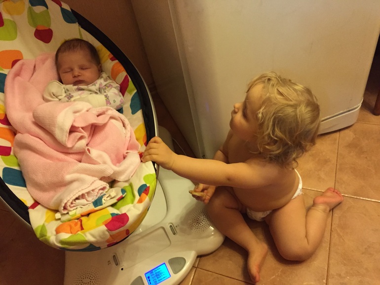 С Лилей, как и с Алисой, очень освобождает руки наша электрическая качалка 4момс. Алиса очень удивила тем, что оказалась очень нежной и заботливой в свои 1,4 года по отношении к ляле Лиле:) Меня поразил момент на днях, когда Алиса аккуратно достала из волос Лили маленькую ниточку и поцеловала ее:) Заботливая малышка:) А я-то думала Алиса на Лилю пару месяцев точно внимание обращать не будет! Переодически Алиса подходит к Лилиной кроватке и качает ее( у нас маятник продольный). Уже хорошо качает, не так сильно и резко как по началу. Ревности, ттт, нет вообще. Алиса даже дает Лиле пустышку, когда Лиля в качалке и пустышка у нее выпадет или ее выплюнет. То, что Лиля пустышку на хочет и вообще спит - не важно:) Главное Алиса заботится:)