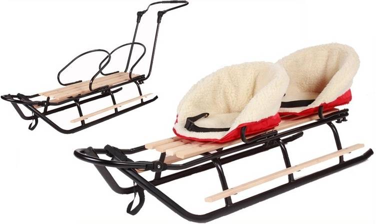Мы на обычных санках, но с ручкой, старшая сидит на краю или стоит как бы на подножке и держится за ручку, ей такой способ очень нравиться