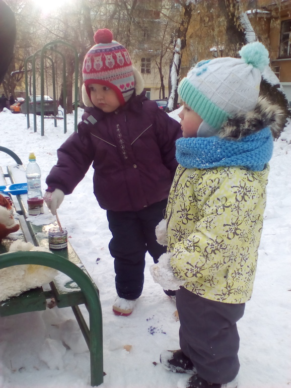 Вот так гуляем)) гуаш с водой и кисточки. Маме влажные салфетки. Вчера слепили, сегодня раскрасили. Завтра в бутылки краску разведу, пойдем сугробы раскрашивать. 2,5 часа рисовали только! Угулялись нехочу)