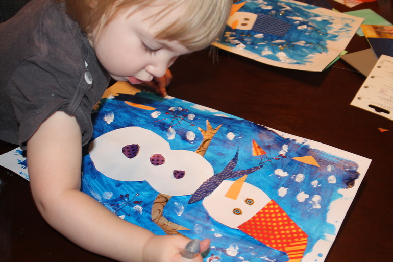 Изначально планировалось, что Снеговичок детскими ручками не очень реалистичный получится, и делать будем растаявшего - чтобы все набекрень, и вроде так задумано.