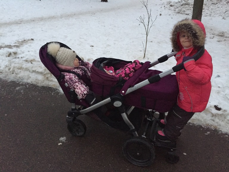 Дети: 9 мес и 2.3, разница 1.7. До 8 мес сына не пользовалась коляской для погодок, так как редко с детьми одна. У нас маленький лифт с непутевыми дверьми - не до конца открываются, габариты 58 двери/108глубина, поэтому выбора не было - joovy caboose. На даче катала фил летом с 3 до 6 мес младшего, но в городе муж говорит не надо его: реагенты, грязь - младший низко к земле ещё надышится, да и не влезает он к нам в лифт. Конечно фил в плане маневренности и управления нравится больше - он основательный, joovy - попроще, но дочке очень нравится стоять на подножке, сидеть на лавочке, коляску она полюбила эту очень. В управлении нормально - надо привыкнуть давить на подножку когда наверх забираешься. Joovy у нас как вторая коляска, с двумя детьми одновременно одна я гуляю нечасто. Когда со старшей отдельно мы без коляски выходим.