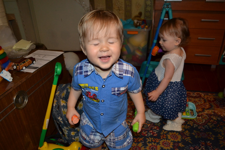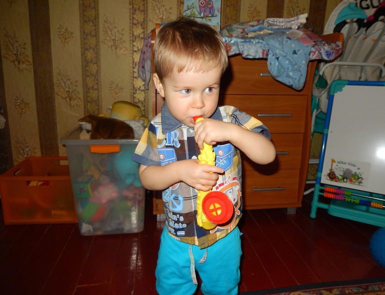 Зубов по-прежнему 16 (4 клыка лезут уже 3 месяца из десны). Чистить их раньше очень любил, но последние два месяца фиг заставишь почему-то: сам что-то повозит зубной щеткой секунд 20 и отдает её мне, мол, я закончил. И мне чистить не даётся совсем, начинает истерить. А смотрю: на передних зубках какой-то налёт как будто желтый, надо бы сходить к стоматологу… Когда в месяц Даши ходили к педиатру, заодно и его измерили. Получается, что он у нас за 8 месяцев прибавил всего 5 см и 2.300 и сейчас стал 84см и 11.700. Ну, ещё бы! Какает ведь 2-3 раза в день, с этим делом проблем у него никогда не было. В первый месяц по 5-7 раз какал.