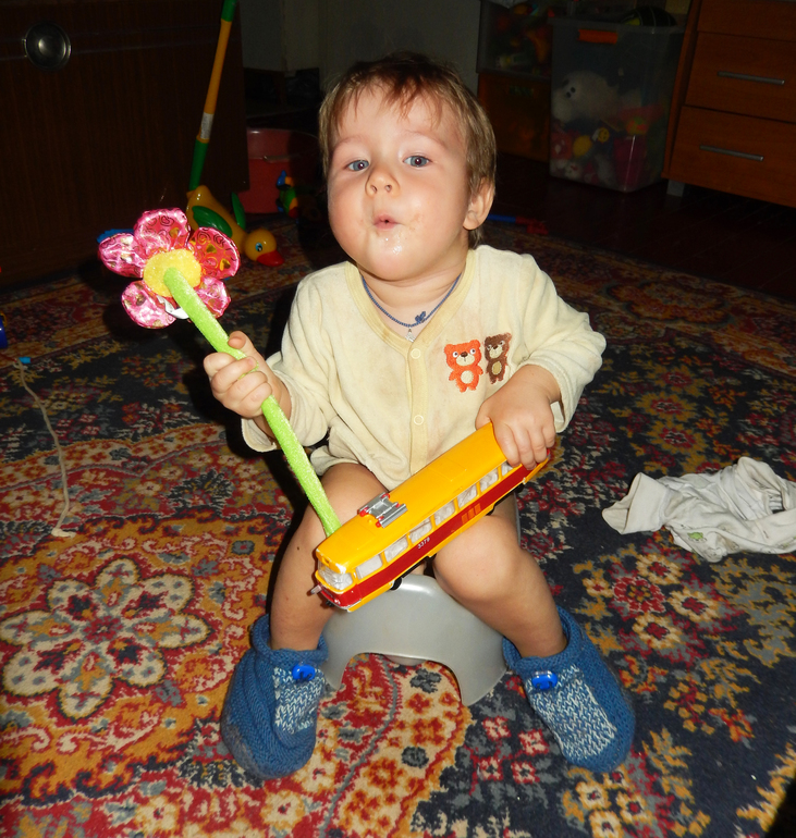 Увидит какую-то крошку на полу или ковре - поднимет обязательно и принесет мне со словами «фу» или «кака». С этим тоже интересно так, он вроде как брезгливый у нас, не дай Бог испачкается сам или игрушка его. На днях стоял смотрел, как наша кошка Умка какала в свой туалет, а потом наклонился чуток, уловил запах и его стошнило!!! Зато вот в подгузники или трусики дела делать его не парит вовсе. Уже год и 8,5 месяцев, скоро в садик, а борьба за горшок уже не первый месяц идёт с переменным успехом.