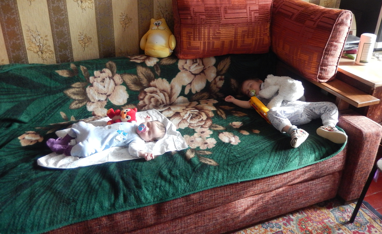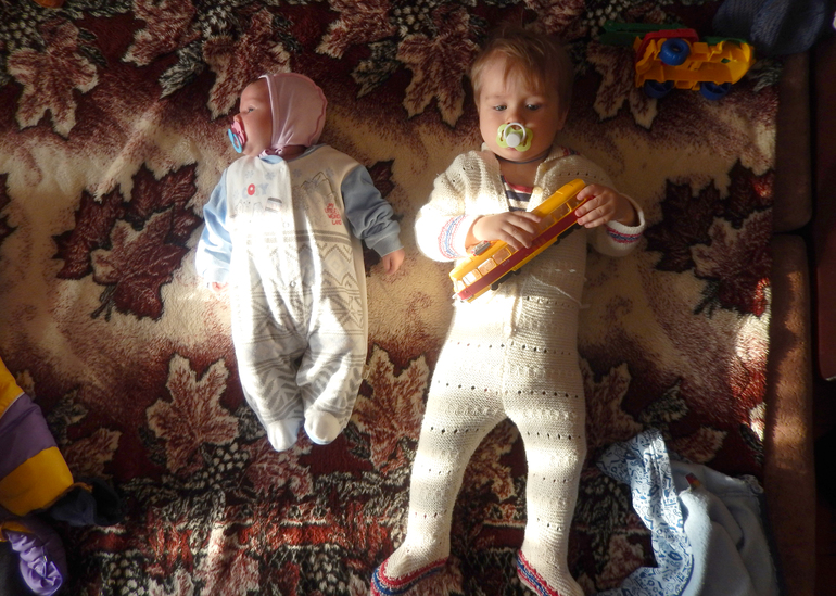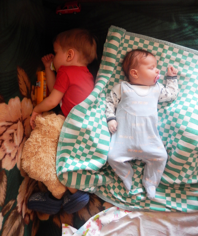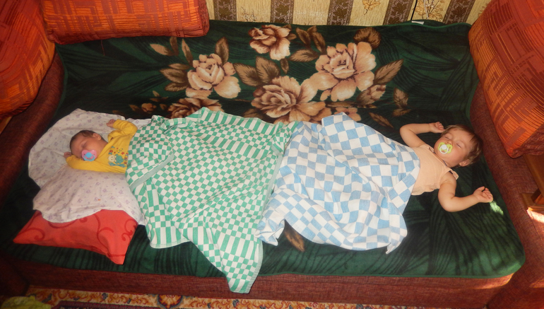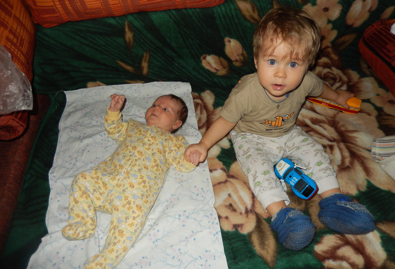 Наши детки (развитие, успехи, фото)Все-таки хоть все детки разные, но никогда не поверю, что с погодками с самого начала бывает просто и легко. Въехать в новый ритм нужно время. Тем более, если папа не такой, что всегда на подхвате. Как у нас. Детей любит безумно, но порой уверен, что я итак сама прекрасно могу справиться и с ними, и с уборкой, и с готовкой и еще поспать параллельно успеваю. Тем не менее, когда прошу помочь, всегда это делает. Просто именно самому по собственному желанию сделать что-то - ну там спать уложить, переодеть, погулять, поиграть, поносить на ручках и прочее - бывает очень редко. Ладно, это не так важно для меня. Главное - чтобы помогал, если прошу. А теперь самое главное - о моих детках. Вчера были в гостях у брата, и, когда пришли, уложили сонную Дашу в кроватку её двоюродной годовалой сестры Миры. Сами все были на кухне и когда в спальню, включив свет, зашел мой брат, он испугался, увидев в кроватке не свою дочь. И вышел к нам, со смехом говоря: «всё никак не могу привыкнуть, что у тебя двое детей». И тут я себя поймала на мысли, что я сама еще к этому за полтора месяца не привыкла. Хотя время бежит сейчас гораздо быстрее, чем когда Стёпа был у меня один…