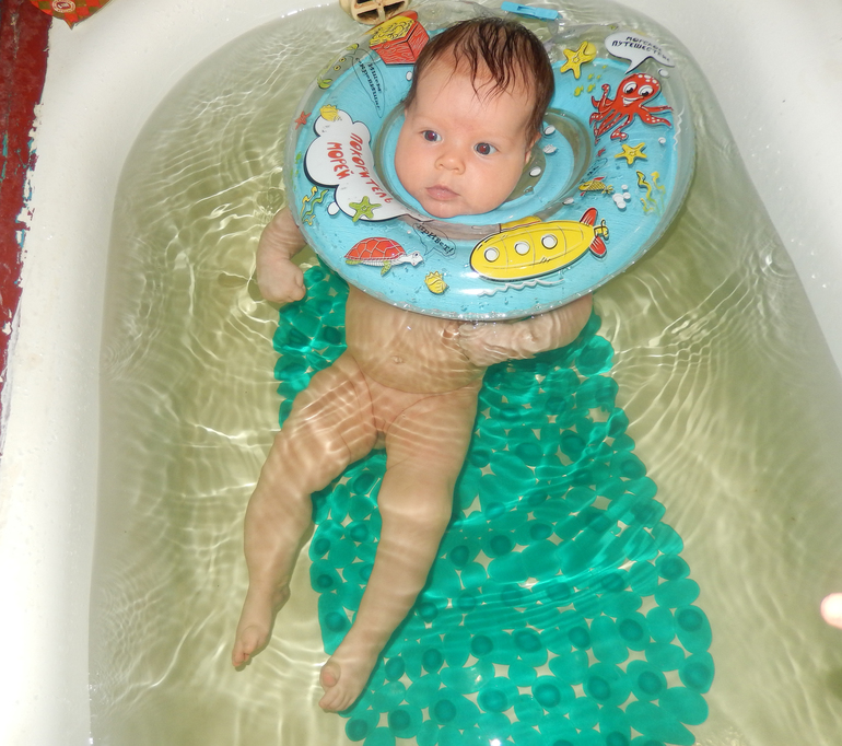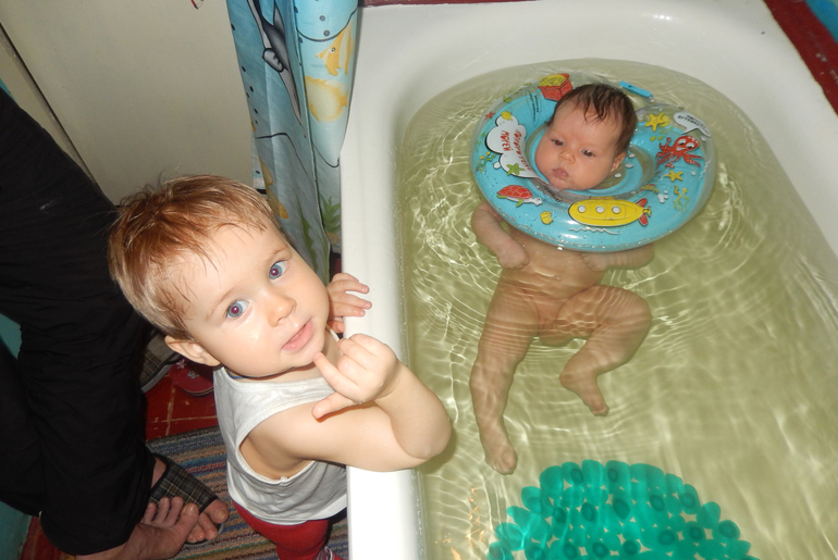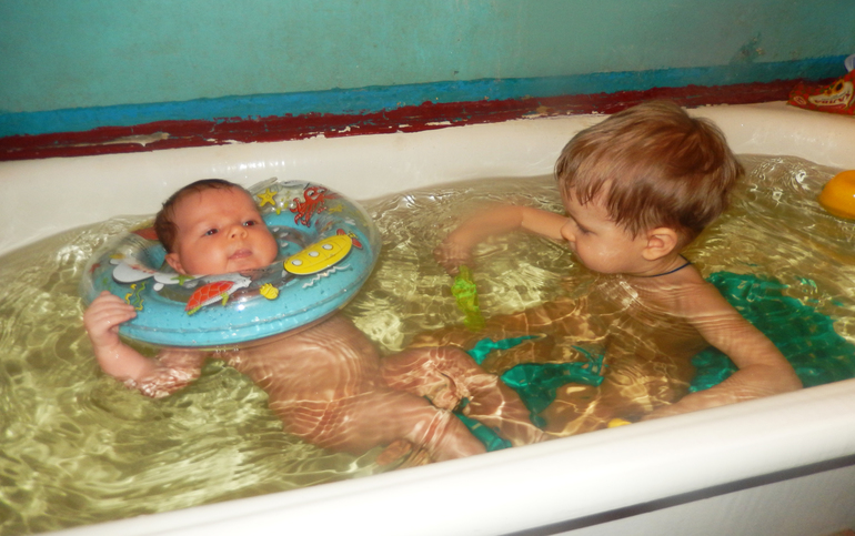 Недавно устроили первое совместное купание. Набрали в ванну воды, пустили в неё сначала Дашу в круге, а Стёпа нетерпеливо засовывал руки в воду. Доче понравилось, с довольной мордахой бороздила водную гладь. Потом посадили в эту же ванну Стёпу на антискользящий коврик. Сначала пытался «помогать» сестре отталкивая круг от себя, потом занялся своими игрушками. Удивительно какие разные дети! Стёпе круг никогда не нравился - через полминуты уже начинал плакать и попробовав так несколько раз мы смирились: чего ребенка мучить, если он явно не получает удовольствия?! Так что до полугода он замечательно купался лёжа в горке, сначала один, потом с игрушками. И по полчаса бывало сидели с ним так, и дольше. Вода - однозначно его стихия. А Даша вот кругом сразу впечатлилась и начала плакать только когда её вынули.