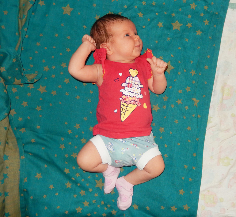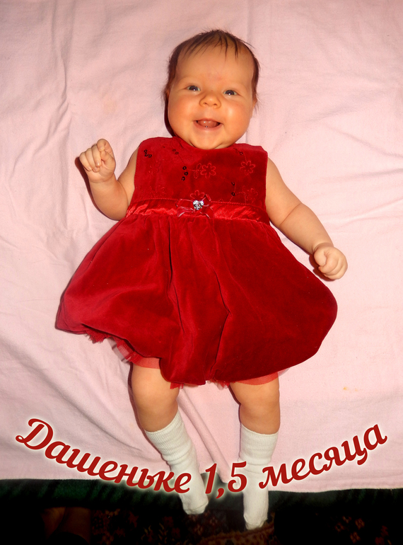 Судя по прибавке за первый месяц молока дочке хватает - набрала 1,150кг. Но почему-то медсестра намерила те же 58 см., что и при рождении. Мерила она точно криво, ибо из огромного количества одежды Даша выросла. К тому же спустя пару дней были у невролога, а потом спросили где можно покормиться и нам открыли пустующий на тот момент кабинет педиатра, где мы были тогда. И мы с мамой решили её измерить. Намерили 64. Ну, пусть мы ошиблись на 1-2, пусть даже на 3-4 см. Но уж до 60 она точно выросла. Бодики и комбезики сейчас носим 62-68. Вот этот офигенский бодик, купленный мною в секонд-хенде, когда ходила еще первенцем беременная одели только раз, когда Даше было 2 недели, ибо на нем написано на рост 56 и еле застегнулся: