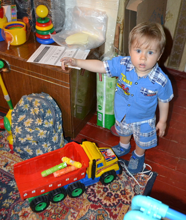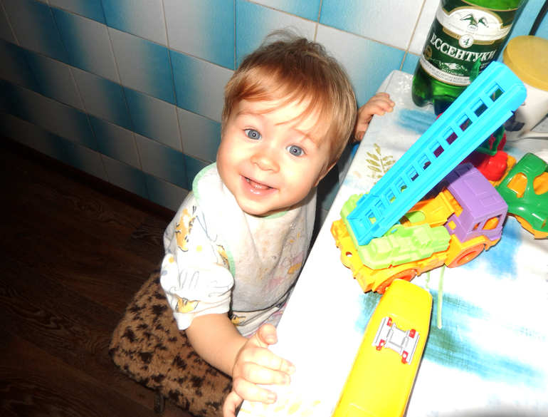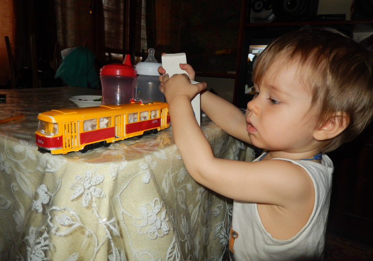 Так как словарный запас у него пока весьма скудный, имя сестрёнки он решил сократить в 2 раза и называет её просто «Ша». Это интересно тем, что двоюродную сестрёнку Миру он называет «Ми». Хотя не только её, «ми» - это также мишка и мыло. Вообще окончания не особо любит, поэтому «пупо» - это пупок, «ти-та» - это тик-так, часы, «кра» - это кран. Кроме стандартных полностью выговариваемых «мама, папа, баба, дядя», говорит «ещё», «всё», «биби» - машина, «и-гого» - лошадка, «бубух» - выстрел, пушка, салют, «пси» - печенька, пастила, «сю» - сок, «ню» - носик, и почему-то «кага» - это трамвай. О, этот трамвай!. Не знала, что можно настолько влюбиться в этот транспорт вообще и в игрушку в частности. Эта моделька перешла к нам с полгода назад бесплатно от знакомой и 4 месяца он её практически не замечал, а потом мы переехали в другой район, периодически гуляем до трамвайный путей и Стёпа моментально узрел сходство. Теперь это любимейшая игрушка, он с ней ест, спит, сидит на горшке, гуляет и даже один раз (я не доглядела) утащил её в ванну и искупал. После этого «кага» перестал издавать звуки, но не стал от этого менее любимым. Признаться, иногда меня охватывает легкая паника - что делать, если трамвай потеряется? Стараюсь об этом не думать… Но когда сын, забыв его переключается на другие игрушки и замечательно проводит время, но потом внезапно вспоминает, что забыл про него, в его глазах читается неподдельный ужас, он театрально разводит руками в стороны и восклицает «КОГА?!?!?!?!», мол, где он???? И тогда я начинаю вспоминать и говорю, например - ну, в ванной, на коврике ты его оставил или на кухне под табуреткой. Тут же кидается на поиски (причем прекрасно понимает, что говорю и идет именно туда) и когда возвращается с потерянным и вновь обретенным сокровищем, , то такое счастье в глазах светится, что начинаю завидовать, что я не трамвай))). Иногда представляю, как лет через 15-17 буду его подкалывать, рассказывая про любимый «кога». Внутрь трамвая он через дверцы напихал ваты. Наверно, так ему представляется людская масса. Однажды распсиховался, что не может её достать, я взяла пинцет и показала, как это можно сделать. Моментально всё понял и целый час занимался тем, что вытаскивал и засовывал назад «людей».