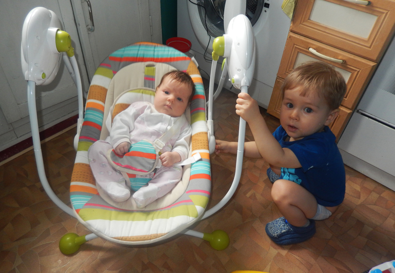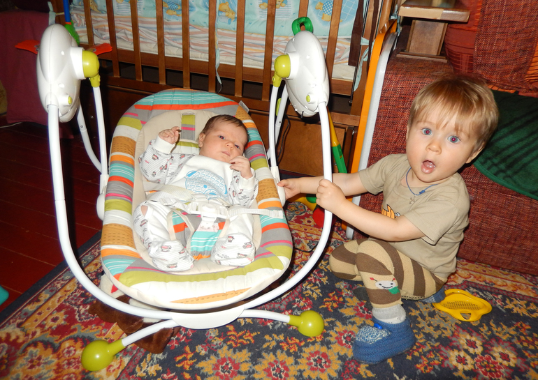 Итак, разница моих деток получилась считай ровно год и 7 месяцев (Стёпка родился 4 июня, а Даша 3 января). Первые пару недель Стёпа ревновал сестрёнку, а потом вроде как свыкся, что она с нами навсегда. Даже катает её на качельках с удовольствием. Правда, по-мальчишески, чересчур сильно, приходится останавливать:
