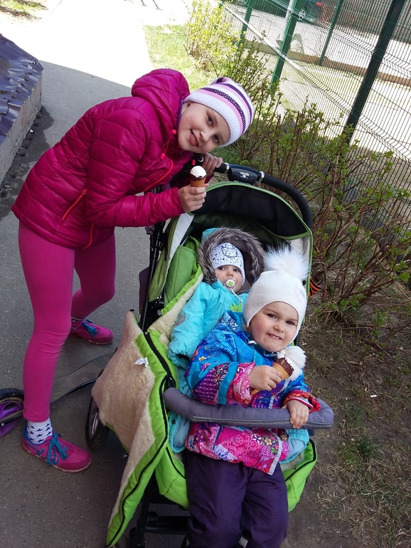 А это в выходные, уезжали на другую квартиру, а там эта коляска стоит, прокатились один раз вот так. Тесно конечно. Но детям весело))