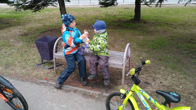Погодки от 3 до 5 лет младшегоСобирались сегодня на прогулку, на градуснике было +4, думала холодно, но нет предела совершенству, прошел дождик, и позже стало +2. Может у меня склероз, но вот не помню такого лета в сознательной жизни, чтоб в июне и нет листьев на деревьях (с прошлого года сохранились фото, где в конце мая цвела яблоня на даче и первоцветы с нарциссами)...