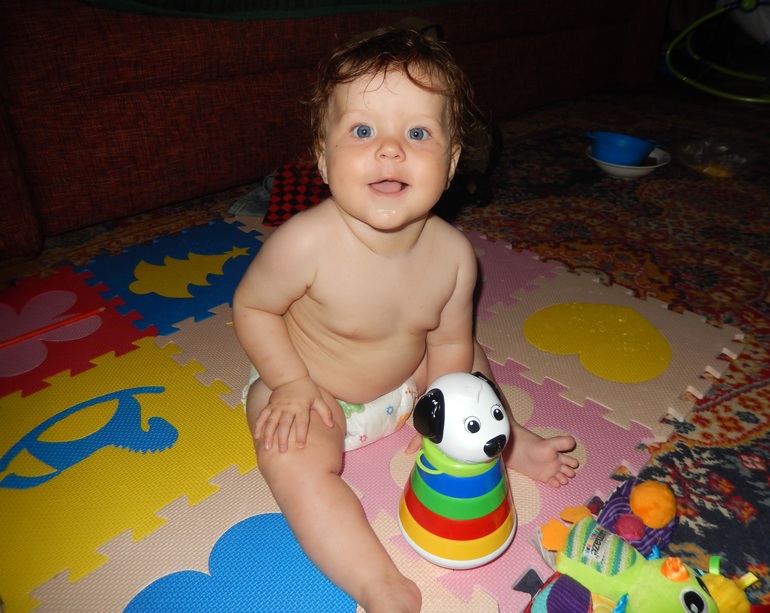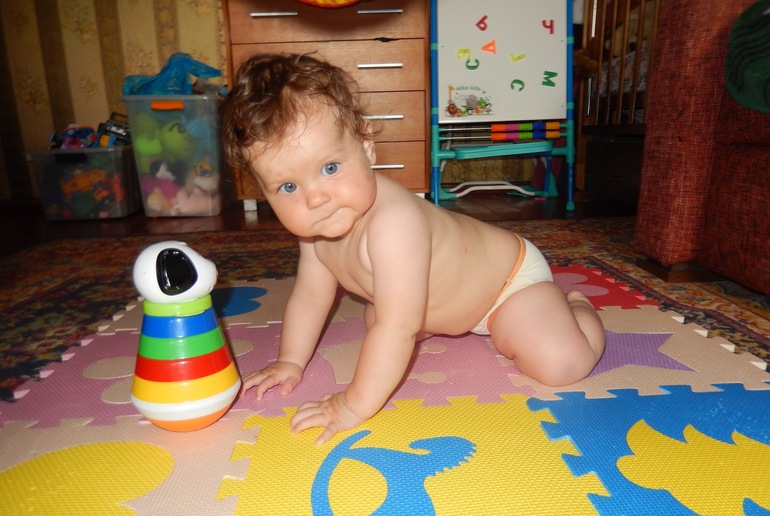 Теперь про дочу. К полугоду Дарья прибавила 3 см и 500 грамм и стала 70см. и 8.800. Это на 2 см. ниже и на полкило больше, чем Степка в полгода, так что она у нас, получается, поупитаннее будет. Прививок до года решили не делать - пусть появится и начнёт работать сначала собственный иммунитет. Пару недель назад стала опираясь на колени смешно раскачиваться взад-вперед. Еще немного отползает назад и крутится на 180 градусов, на диване не оставишь, почти всегда на коврике из пазлов на полу. Для меня это что-то новое, т.к. Степа не ползал вообще.