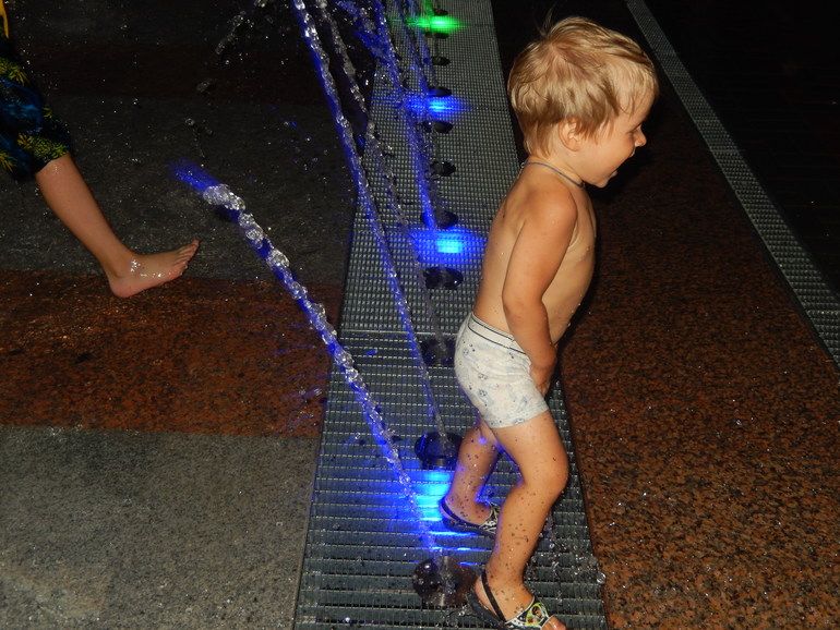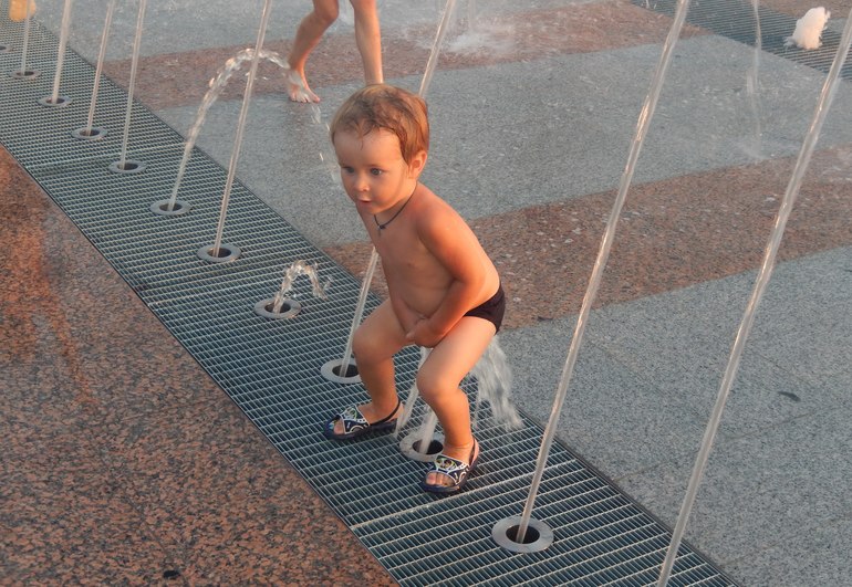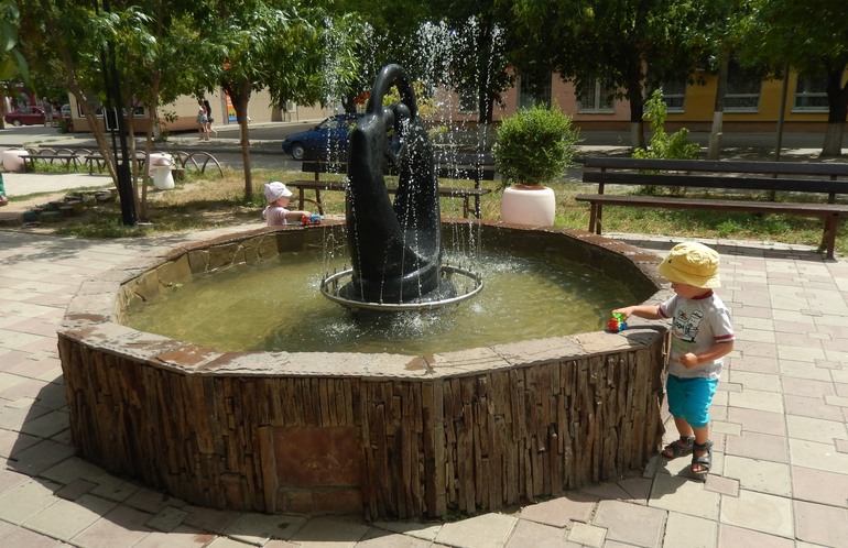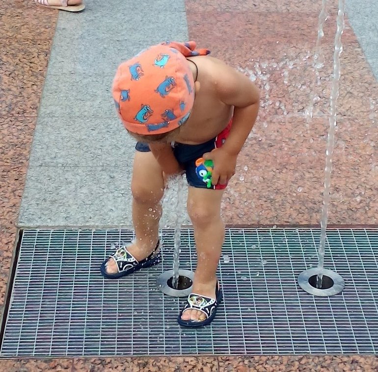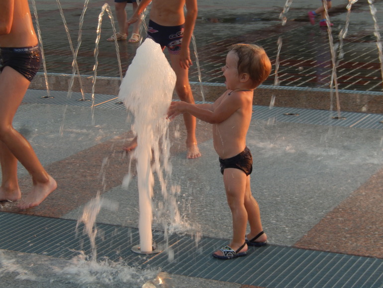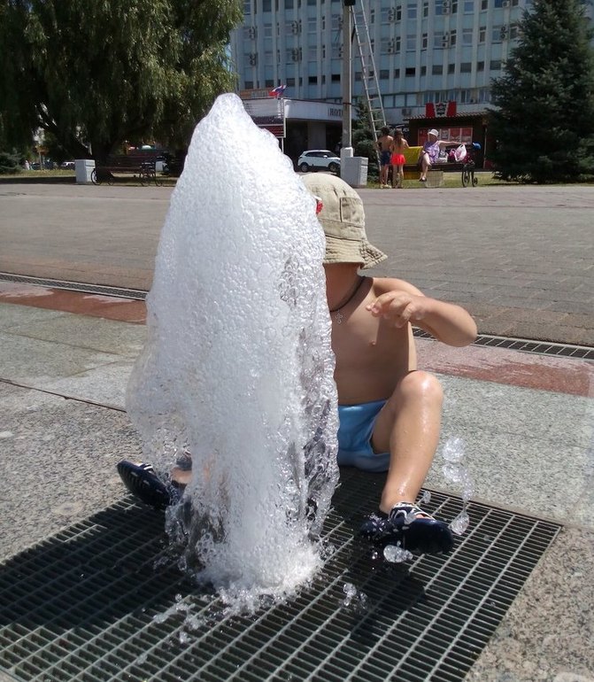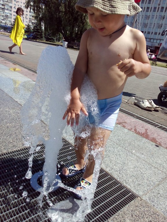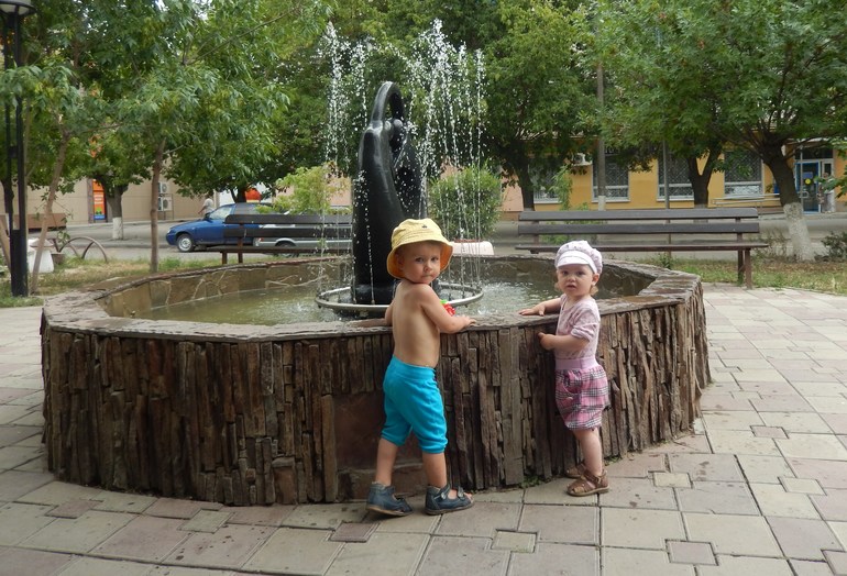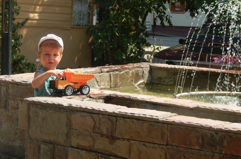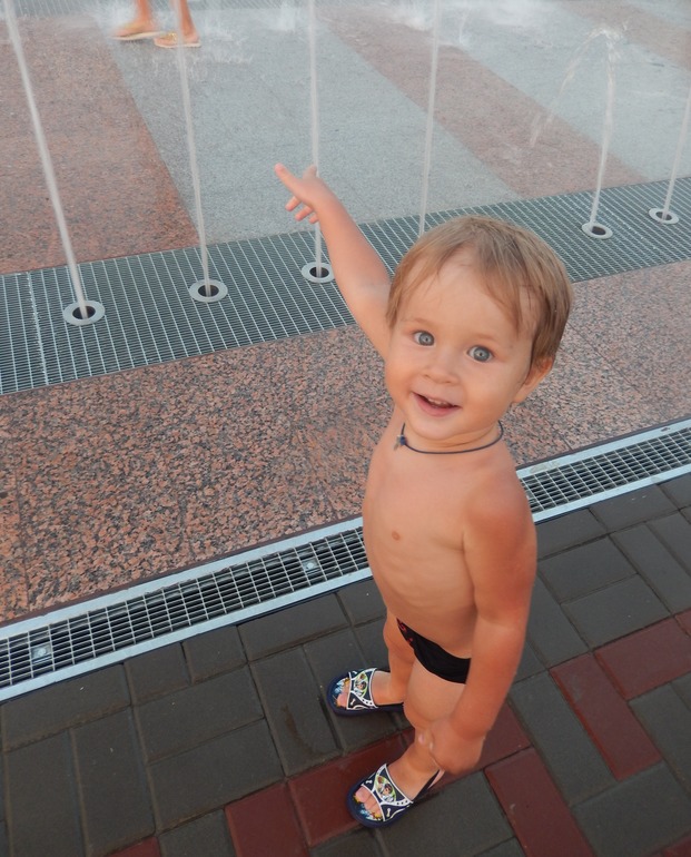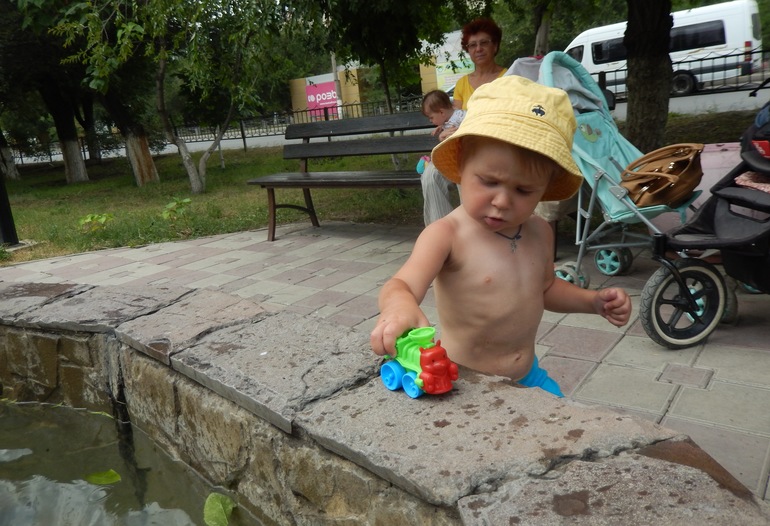 Любимые занятия, которые он может делать, наверно, часами,- это кататься или катать карусель, возить машинки по фонтанам на аллее и мочить задницу в новеньком фонтане)) и яйца закалять. По-другому и не назовешь, вода лично для меня холодная, но детки там носятся с 10 утра до 8 вечера только так. А еще когда ездеем к свекрови в Волжский, там тоже такой фонтан есть, всегда до него гуляем летом. Вообще вода у него всегда вызывает дикий восторг.