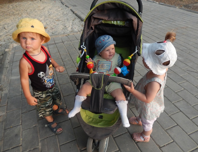 Недалеко от нас живет мой младший братишка с женой и дочкой и гуляем часто вместе. А т.к. гуляет часто с Мирой моя мама, люди думают, что у меня трое погодок))) У Стёпы особая нежность к двоюродной сестренке, а у той к Даше. Но могут и ударить друг друга, и укусить, и палкой в глаз ткнуть, и бычок в рот засунуть, так что глаз да глаз за ними всегда нужен. Втроём - это уже банда!!!