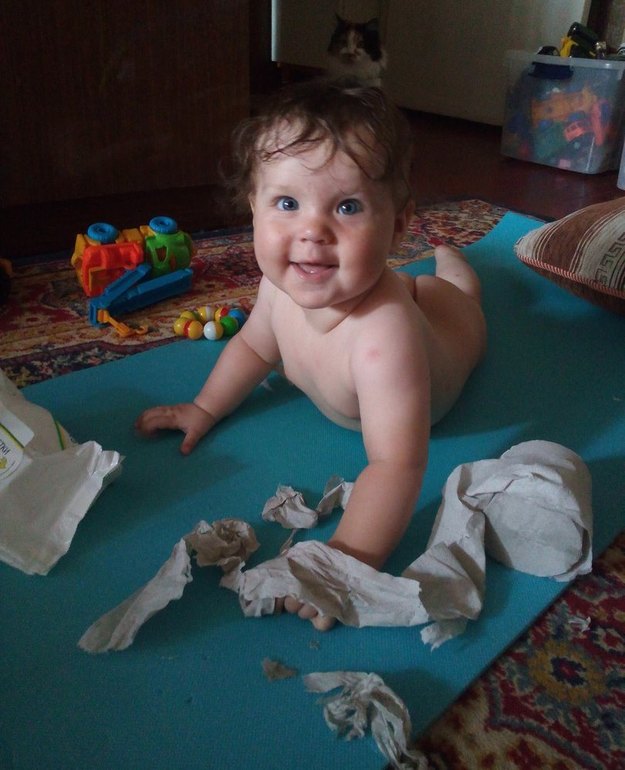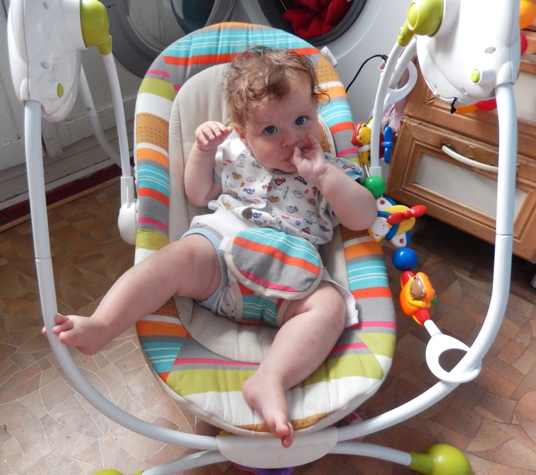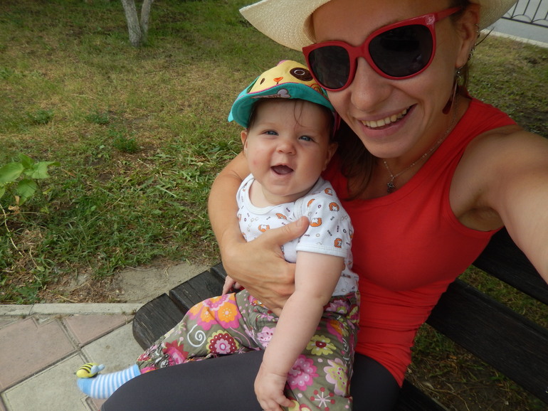 С дневным сном лучше: бывают сны по-прежнему по 15-20 минут, но может теперь проспать и час и полтора. Спит раза 3-4 за день, из которых 2 сна на улице. Сама еще не садится из лежачего положения, но если лежит в коляске под 45 градусов или подушке, сама принимает вертикальное положение и сидит относительно уверенно. Степа так сидел месяцем позже. После полугода почему-то вдруг стала спать на животе. Но ночью только. Очень любит улыбаться, но незнакомому человеку не будет. И девочка ручная только с мамой, у другого сидеть не будет, сразу хандрит. Зубов нет, даже намёка. Мне кажется, что до восьми и не появится, а то и позже. Она у меня Чудо. Такая прям девчонка-девчонка. Очень любит петь и гулить. И я ей безумно благодарна за крепкий ночной сон в среднем с 10 вечера до 7 утра. Еще когда готовлю, а Стёпа занят машинками, она со мной на кухне в шезлонге. Я забываю его включать и она приноровилась катать себя сама. Отталкивается одной ножкой и катается: