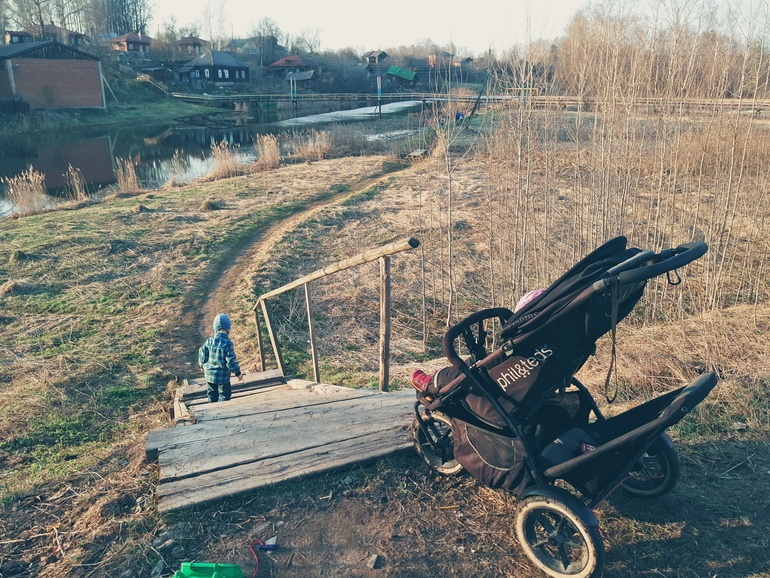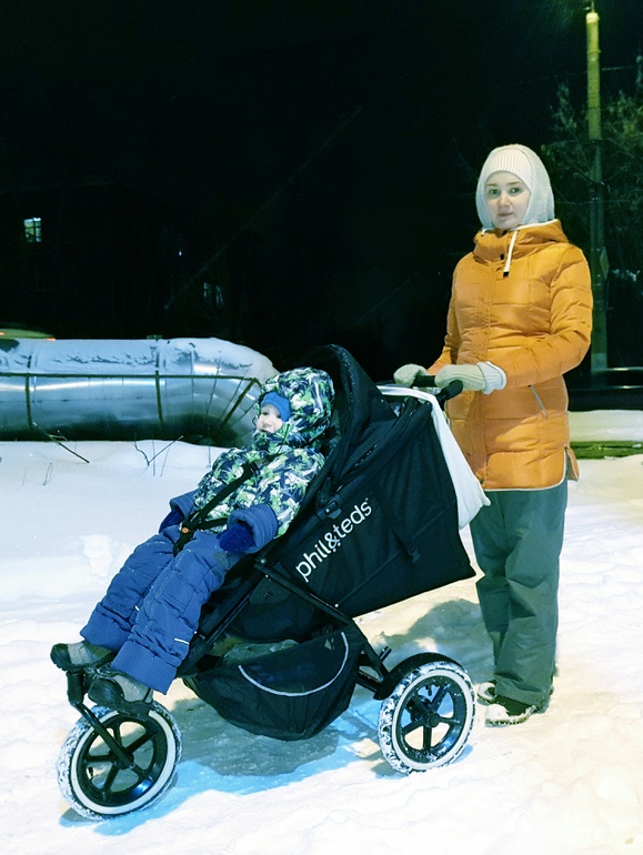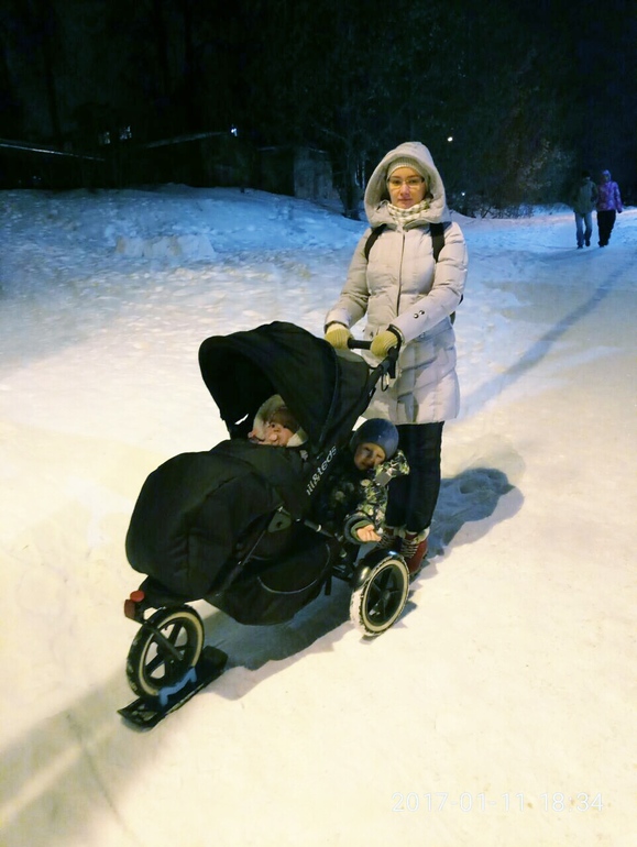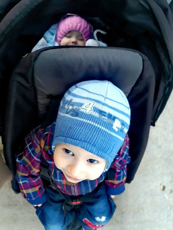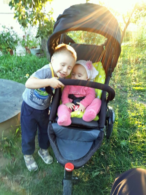 Коротко: коляска-ишак, выручалка и вездеход. Младший ребенок (новорожденный) находится внизу на основном сиденье в люльке-переноске, а старший сидит вверху на доп.сиденье.