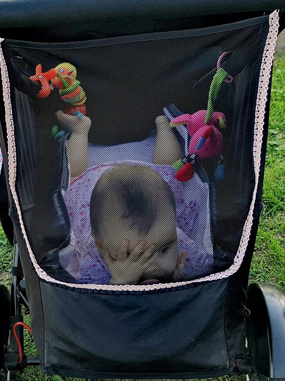 Правда ребенок постоянно игрался с ним и дергал, и я решила его просто пришить к основному, теперь опускается до бампера, что удобно когда карапуз уснул, и никто не заглядывает и солнце не мешает.