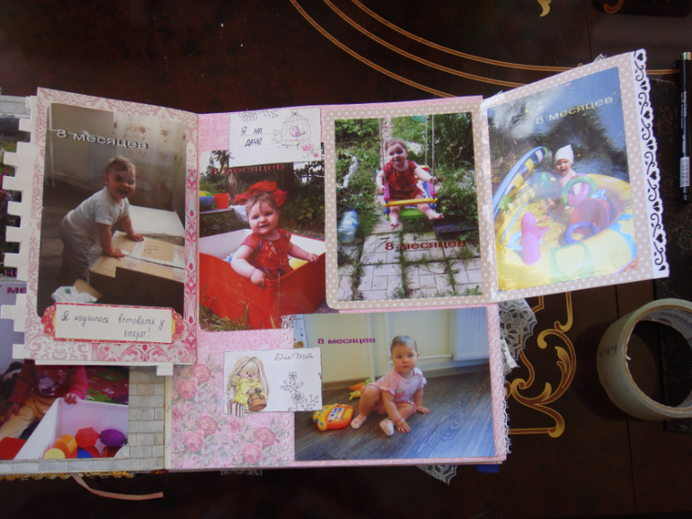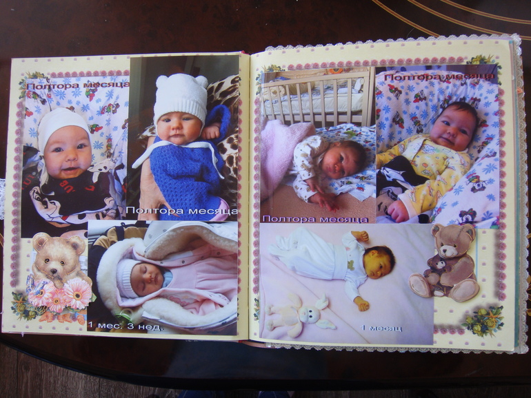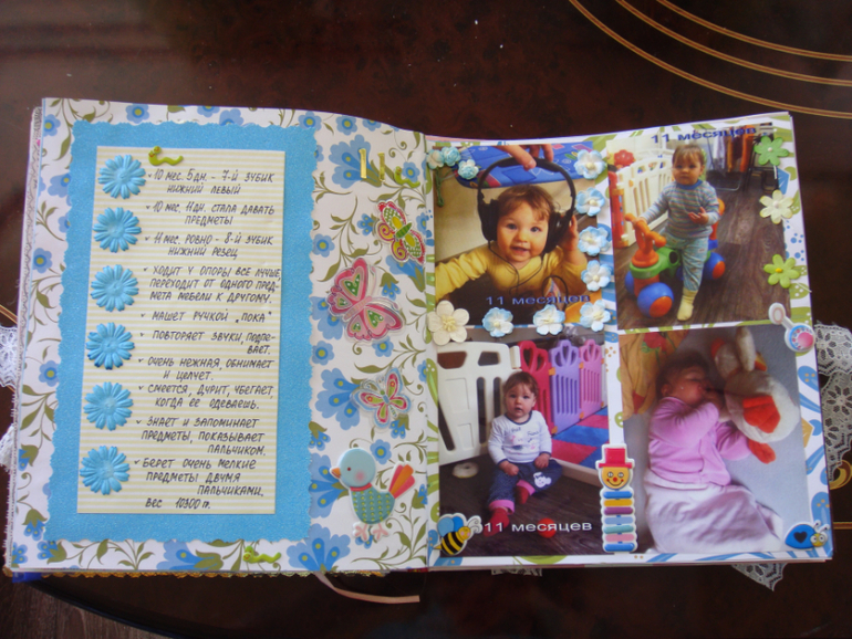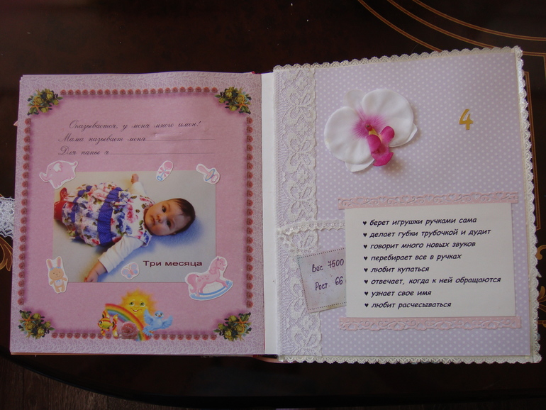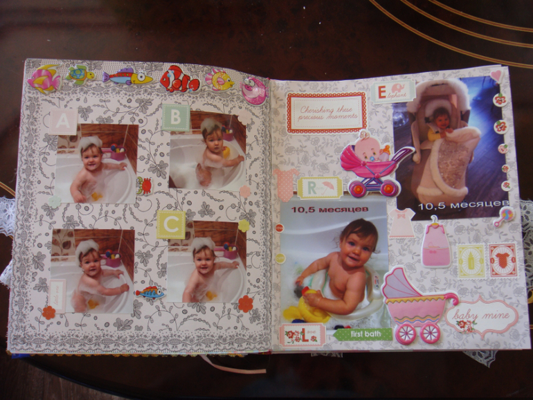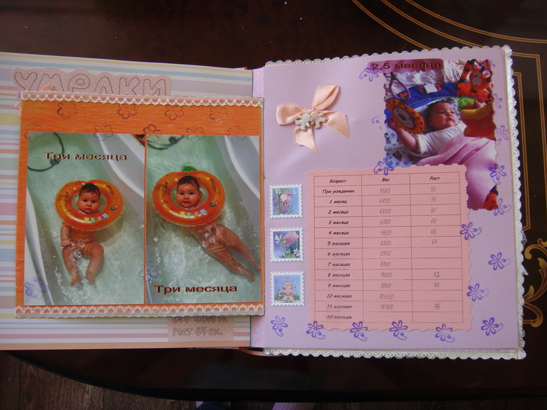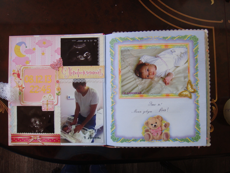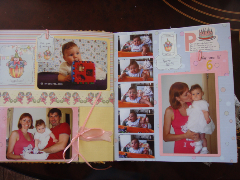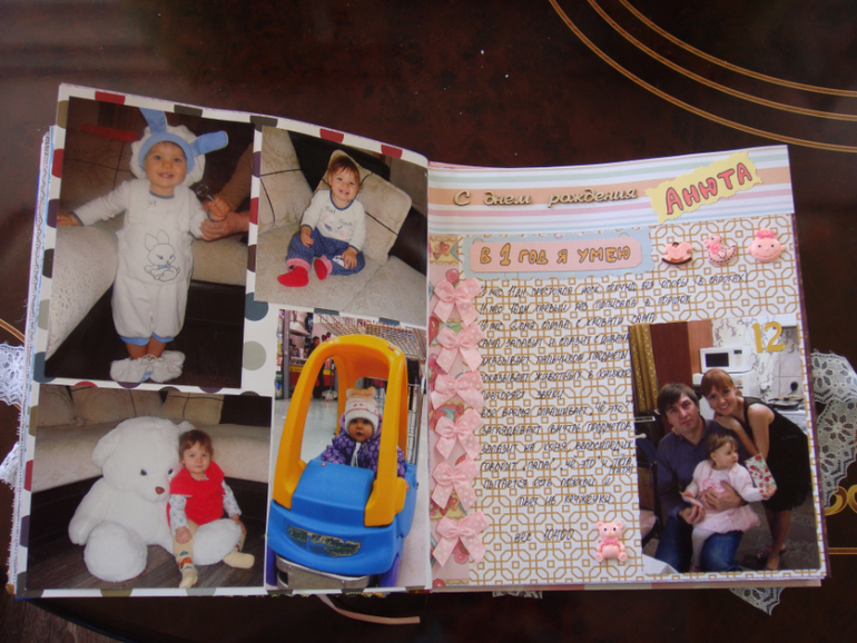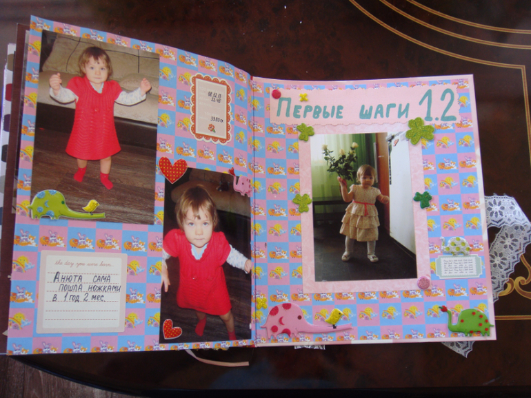 Наши детки (развитие, успехи, фото)Делала для Анечки от рождения и до первых шагов. Из того, что было. Начала переделывать обычный покупной альбом, а потом так втянулась в процесс, что стала туда кучу страниц вклеивать. В правила скрапбукинга не вникала, лишнего старалась не покупать. Долго, получая удовольствие от процесса, и только недавно закончила (ей уже 3,8)))). Для сыночка делать не буду, ему закажу фотокнигу в твердом переплете)).