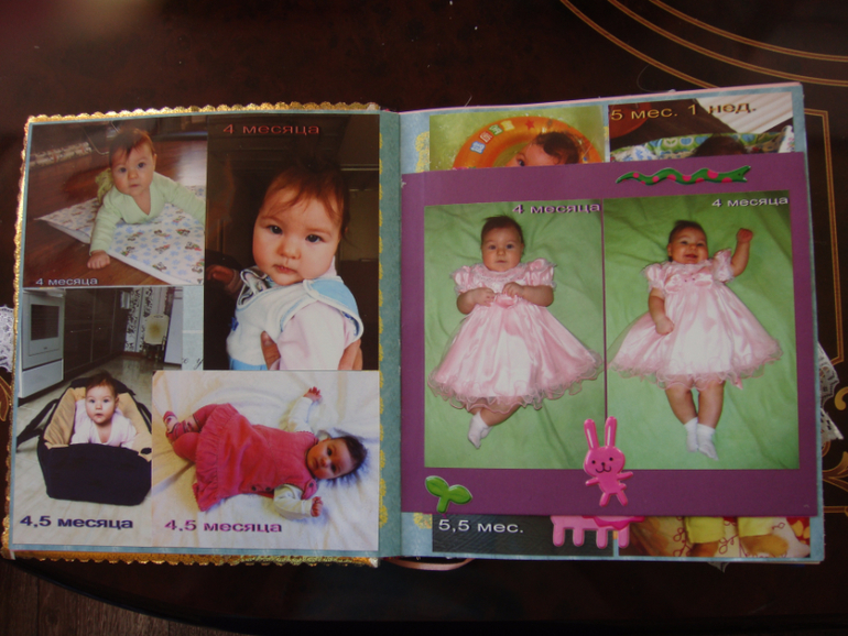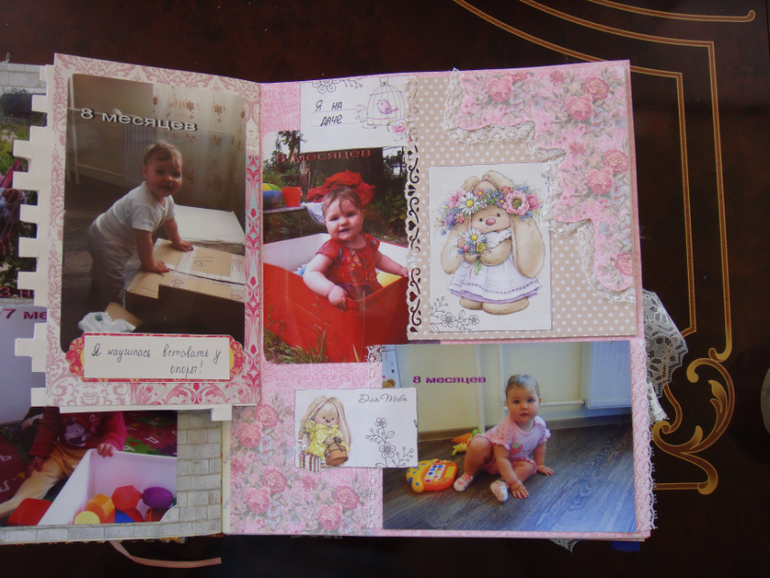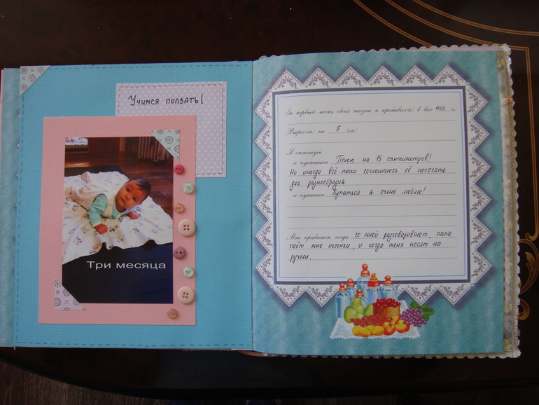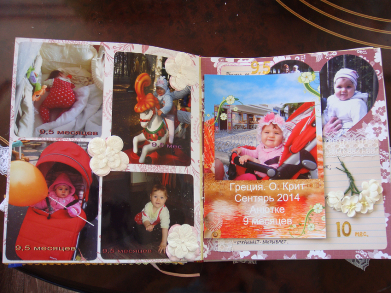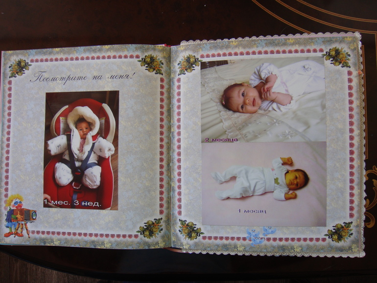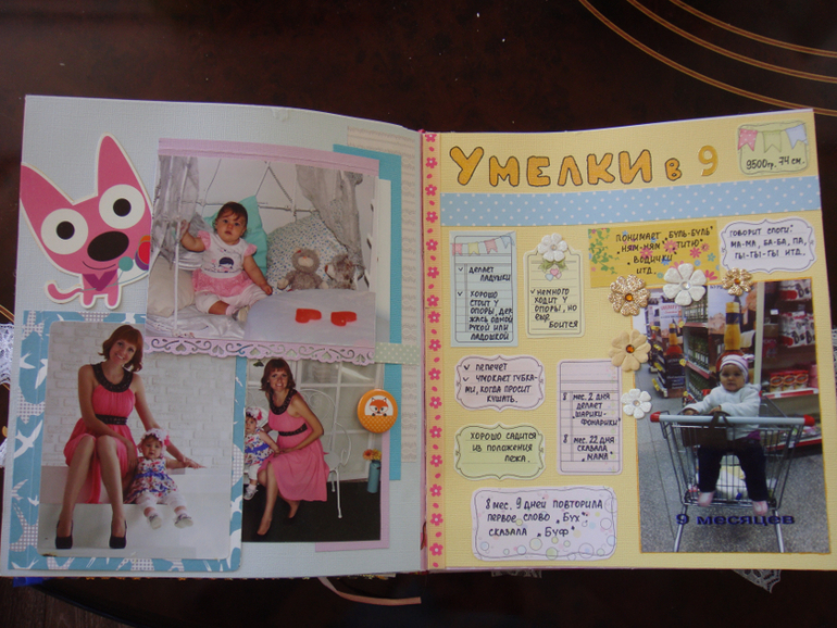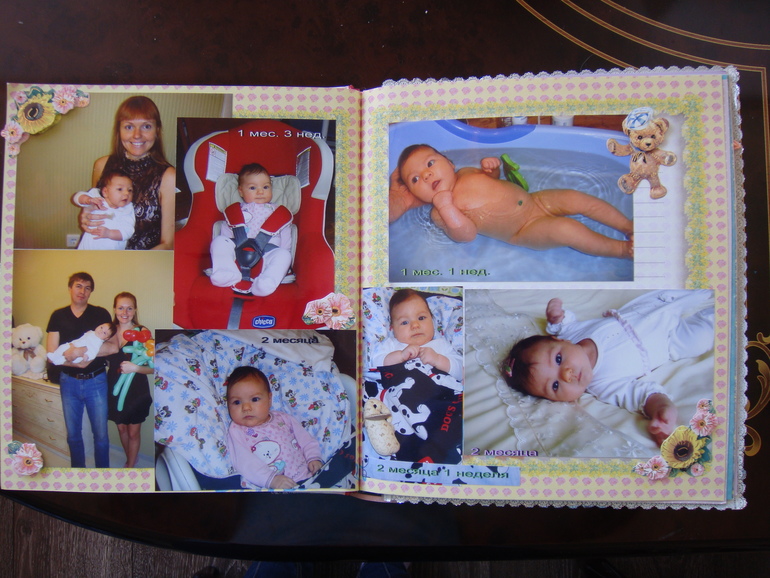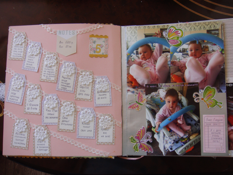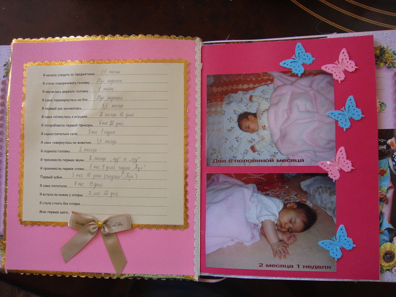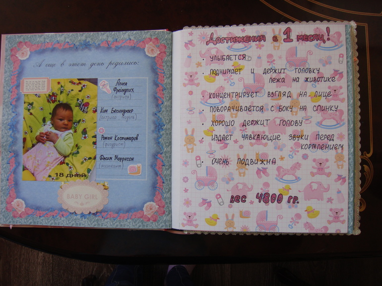 Наши детки (развитие, успехи, фото)Делала для Анечки от рождения и до первых шагов. Из того, что было. Начала переделывать обычный покупной альбом, а потом так втянулась в процесс, что стала туда кучу страниц вклеивать. В правила скрапбукинга не вникала, лишнего старалась не покупать. Долго, получая удовольствие от процесса, и только недавно закончила (ей уже 3,8)))). Для сыночка делать не буду, ему закажу фотокнигу в твердом переплете)).