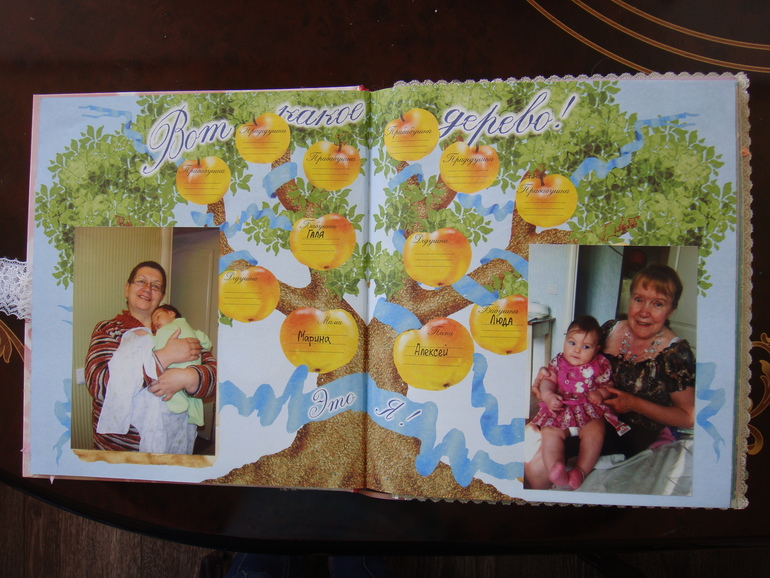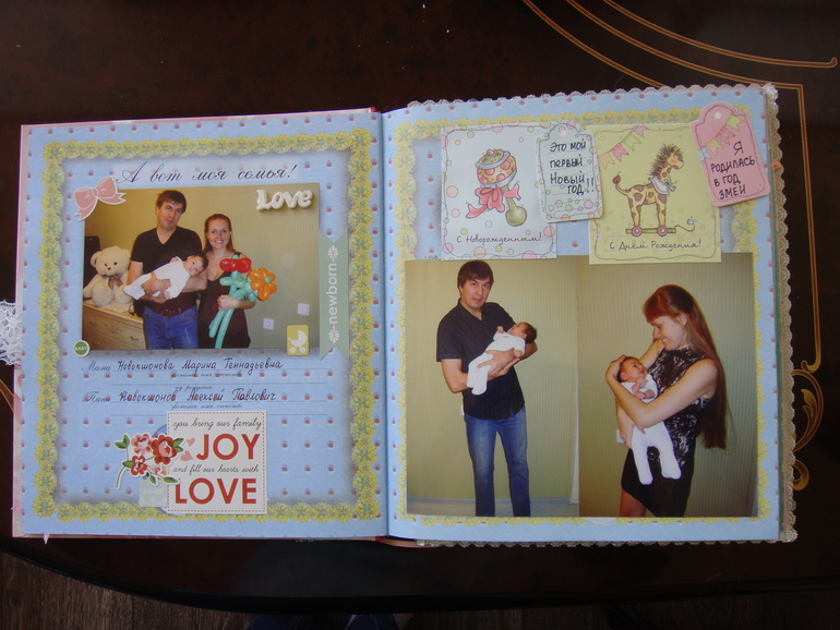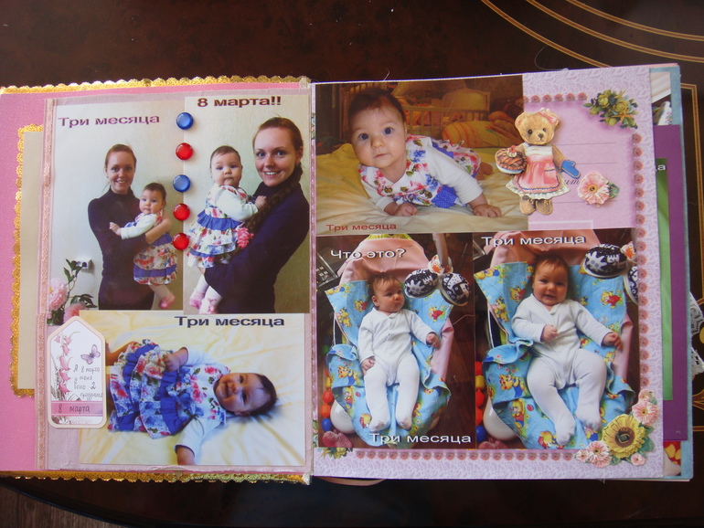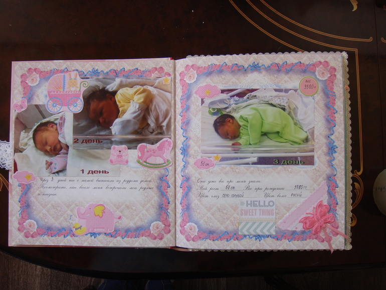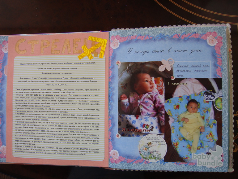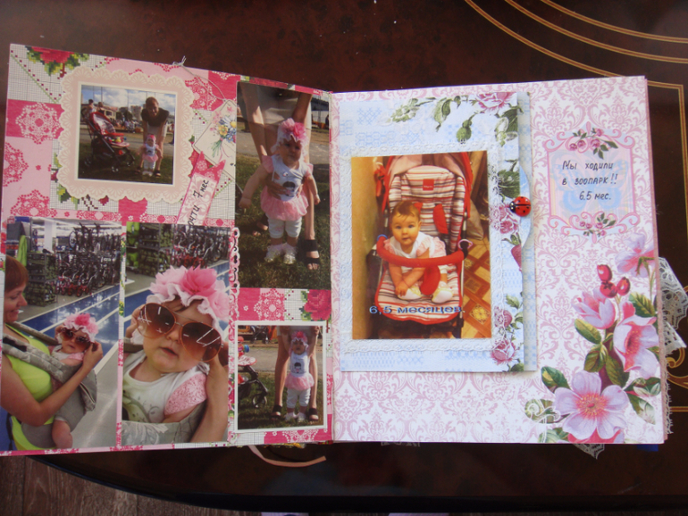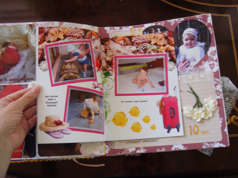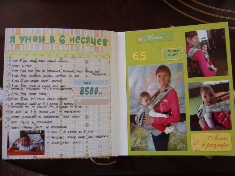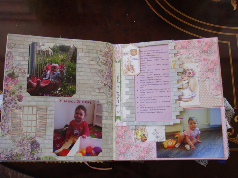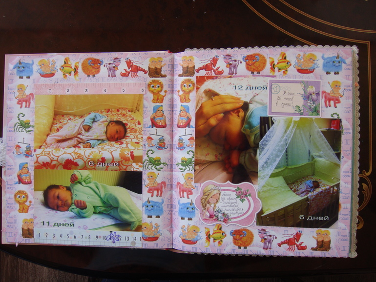 Наши детки (развитие, успехи, фото)Делала для Анечки от рождения и до первых шагов. Из того, что было. Начала переделывать обычный покупной альбом, а потом так втянулась в процесс, что стала туда кучу страниц вклеивать. В правила скрапбукинга не вникала, лишнего старалась не покупать. Долго, получая удовольствие от процесса, и только недавно закончила (ей уже 3,8)))). Для сыночка делать не буду, ему закажу фотокнигу в твердом переплете)).