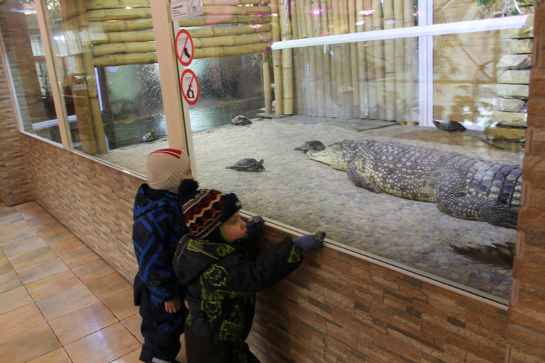 Серёжа наконец увидел крокодила - оказывается, это была его мечта. Ещё надолго застрял в павильоне у сурикатов. Мите понравились лебеди и козлы. А мне - жираф :-)