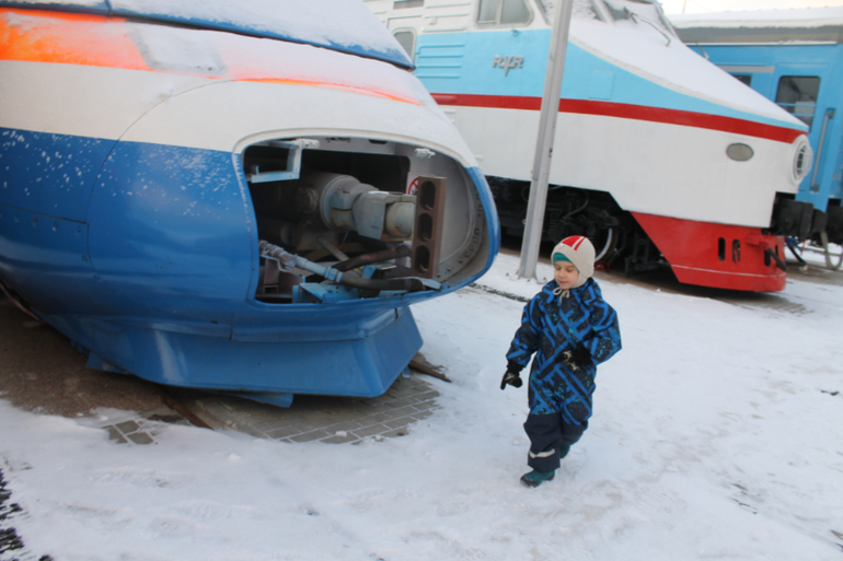 На следующий день отдыхали опять. И потом тоже (понедельник и вторник - выходные в большинстве музеев). Я долго выбирала последнее место, куда сводить детей. Хотелось на ледокол или подводную лодку, или на "Аврору" - но в эти дни похолодало, и музеи "на свежем воздухе" отпали. Из крытых детей заинтересовал бы Артиллерийский, они долго и дотошно выясняли, можно ли там лазать по "пушкам". Когда поняли, что скорее всего, нет, то интерес поувял, но всё равно сходить туда не отказались бы. Но - опять-таки дорога от метро, усталость. Перебирала варианты и нашли идеальный - музей РЖД. Экспозиция и в помещении, и на улице (то есть переодевать мне их - с Андреем-то в слинге - не надо, ура! и погуляют, и в залах погреются). От метро недалеко (после того, как мы героически плелись из зоопарка до метро... это стало очень важным). Ну вообще - должно быть интересно. Серёжа с утра уже насмотрелся фотографий из музея и начал рисовать локомотивы, и поехал туда к одному - скоростному - который больше всего ему понравился. Оказалось, что ещё и билеты нашей многодетной толпе бесплатны. Не только детям, но и мне. Тут я вообще влюбилась в этот музей :-)))