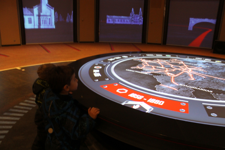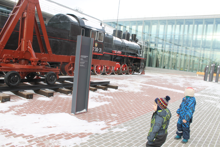 Много всяких интересно-интерактивных штук. Серёжа добросовестно старался читать всё, что написано на экранах, пока я ему не запретила, потому что мы так до вечера не ушли бы. Очень понравилось ему колесо времени. Хотелось бы, конечно, больше мест, "где полазать" - было бы здорово, например, если бы открыли экспозицию внутри какого-нибудь вагона - чтобы там походить да посмотреть, что как было...