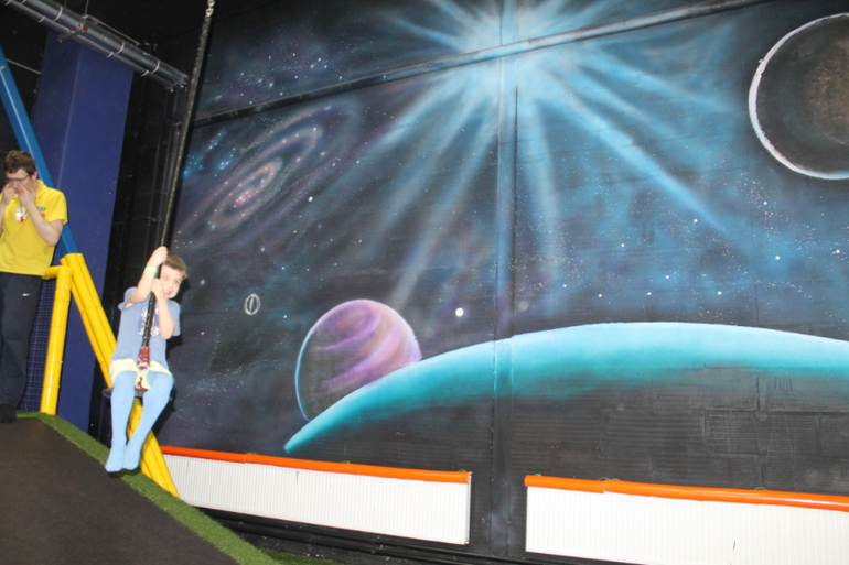 Пару раз сама попрыгала на батуте - когда спящего Андрея удалось уложить под Надиным присмотром на пару стульев в кафе... Этот момент - что ребёнку надо будет спать, а я устану его на себе таскать - был у меня не продуман, конечно. Я уже привыкла, что он всё время на мне спит, но и отдохнуть хотелось. Поэтому так.
