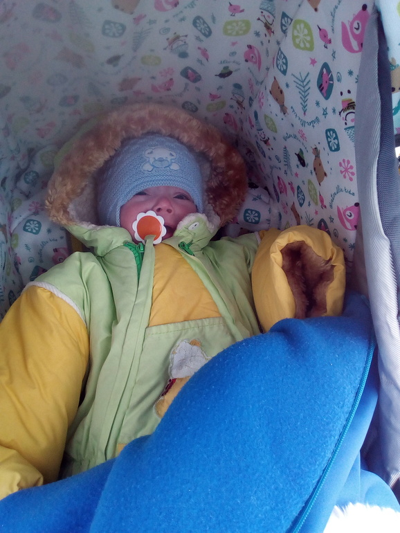 Почти всю прогулку спал, только в начале минут 30 поглазел и в конце минут 10-15. На первой фотографии не спит ещё))