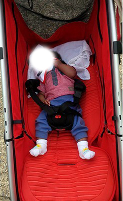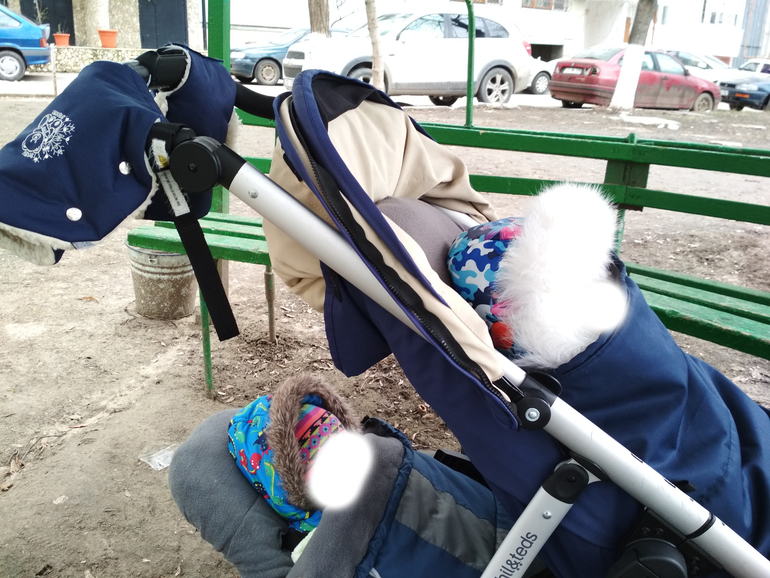 Там же хранятся и сеточки. Капюшона на нижнем сидении нет, но есть на каждое сидение в отдельности сеточки, прикрывающие от ветра или солнца. Фотографию только одну нашла, не самую удачную, но принцип понятен, думаю. Сейчас лето, и мы гуляем с этими сеточками: