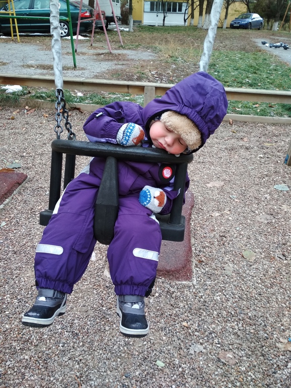 Итак, старшего отвела, вернулась домой, позавтракала, поигрались немного с младшим, которого умыл, поменял и покормил муж, и стали собираться на прогулку. Зима, комбинезон, обувь, младший еще, как назло, не приходит на одевания, а наоборот убегает от тебя (старший в этом возрасте бежал с радостью одеваться!). Когда отловишь и одеваешь, то он почему-то не стоит на ногах, а начинает заваливаться на пол и виснуть на шее, оттого еще сложнее одевать верх комбинезона, когда ноги "не стоят". Коляску вытаскиваю на площадку, сама одета до комбинезона. Младшего в коляску, она его хоть усмиряет как-то - уже там поправляю штрипки, обувь, шапочку одеваю, сама одеваюсь в комбинезон и на выход. По ступеням прыг-прыг-прыг со своего 9 этажа до лифта на 8, там наклониться, снять колесо на Филе, чтобы поместиться в лифт (1 см не хватило в ширину!), в 2 этапа закатить коляску, потом себя и колесо. Внизу все обратно нацепить и прыг-прыг-прыг по ступеням до улицы. Младшего постоянно "выключает" коляска и холод, хотя летом в жару выключала только коляска. Вот не важно, в какое время ты выйдешь, если он не идет ногами, то он засыпает, даже если дома заснул бы через 4 часа при тех же условиях. А ходить ножками - все на дорогу со двора тянет, и в итоге бегаешь таскаешь вырывающегося на себе, не вариант. У нас -4 и ветренно, доехали до площадки через двор, там как космонафт в скафандре топал, падал, рыдал, наклоняешься поднимаешь, лопатку в варежках брать сложно, машинку - еще сложнее, психует, плачет. Лезет на горку, то там наледь, скользко, падает, я с животом за ним и стаскиваю, потому что нереально. Посадила в качелю - доволен, понравилось. Ура, и мне легче, хоть не наклоняюсь. Короче, заснул спустя минут 7 качания. Лучшее место для сна.