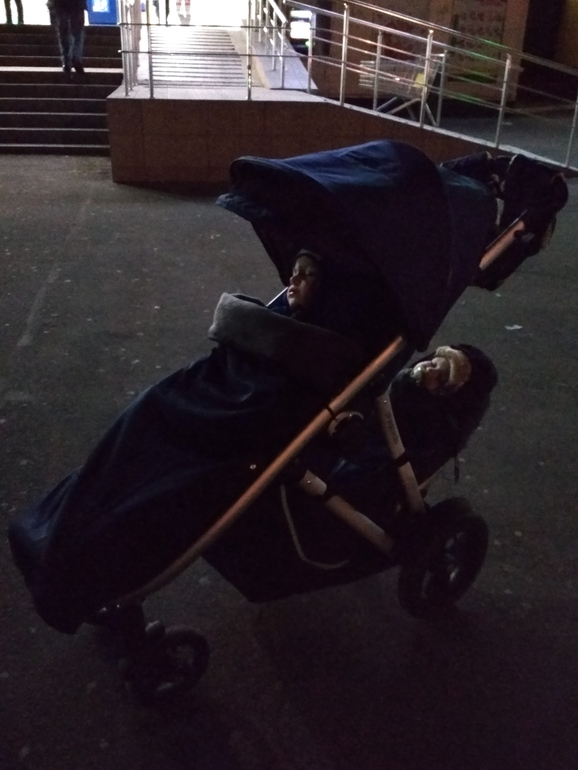 В общем, спустились мы до первого этажа за ручку, потом опять по коридорам, потом усаживание младшего на нижний ярус Фила, застегивание чехла, время. Потом посадка старшего, нам же за мороженым ехать, холодно, поэтому и его в чехол. В 18.10 мы выехали с территории сада, с мужем договорились в магазине встретиться, он с работы, мы с коляской 15 минут хотьбы. На полпути решила со старшим пообщаться, глядь, а они оба спят!