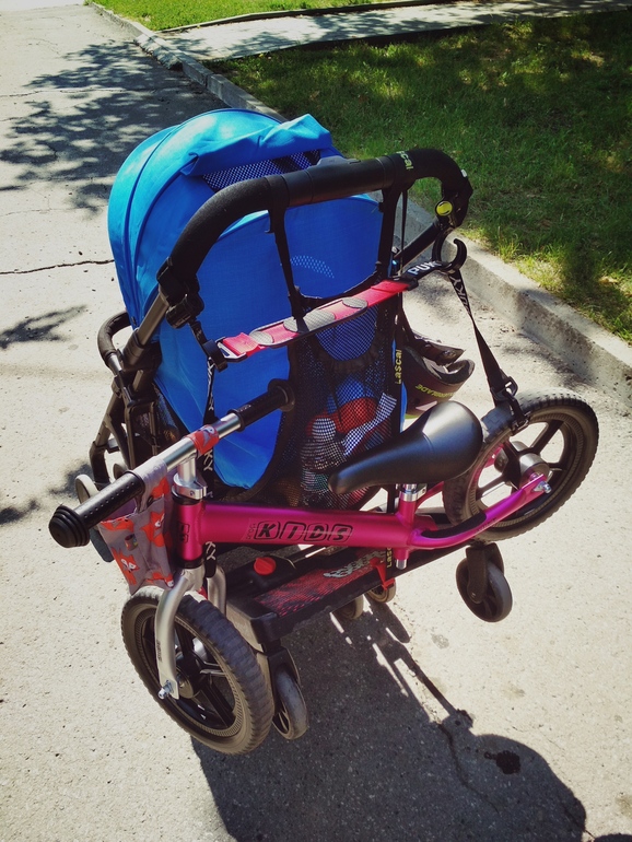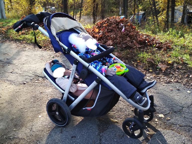 - старший ребенок ходит сам, да, но он идет в _нужном ему_ направлении и с _нужной ему_ скоростью, а маленького надо укачать с большей скоростью движения, к тому же с коляской в зубах я не могу резко дернуться по кустам за старшим, вдруг убегающим к дороге.