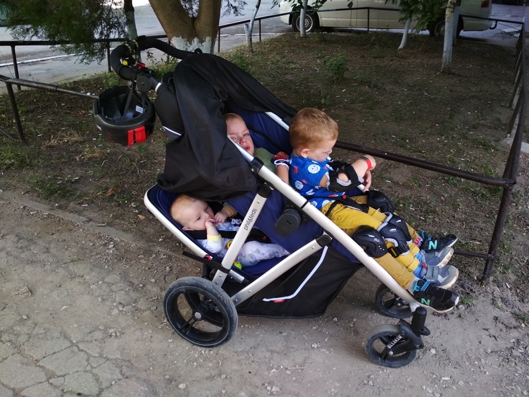 Максу - 3, Дане--1 годик. Тот случай, когда не хватило 10 минут до конца прогулки. Одинарная коляска. Едет конечно, но я нервничала, что сломается и еде не так хорошо, как с одним.