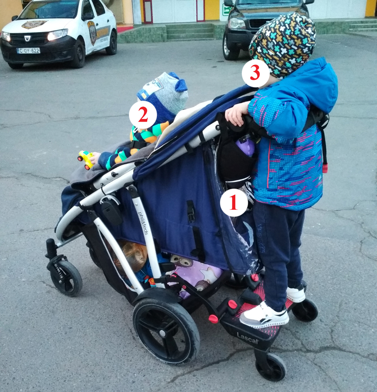 1) Эрго-рюкзак. Тогда младшего можно посадить сюда, вдруг среднему приспичит сесть в коляску. Вариант так себе, потому что от долгого ношения эрго все равно ломит спину + наклоняться в нем неудобно.