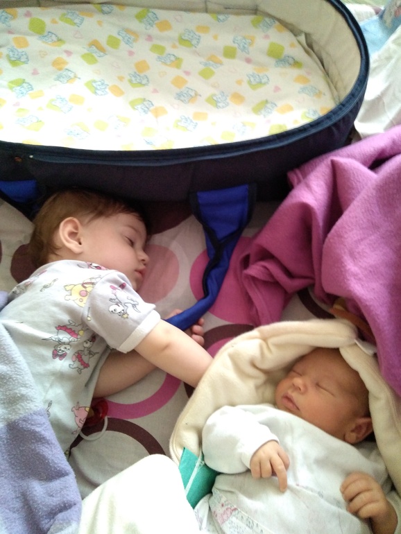 Может валик между ними организовать (куртка). . Я кладу младшего как бы по диаганали. Глубоко и ножки вбок получаются. Даже если откликнется старшая, не придавит. Только сейчас ближе к 6м стали не помещаться.