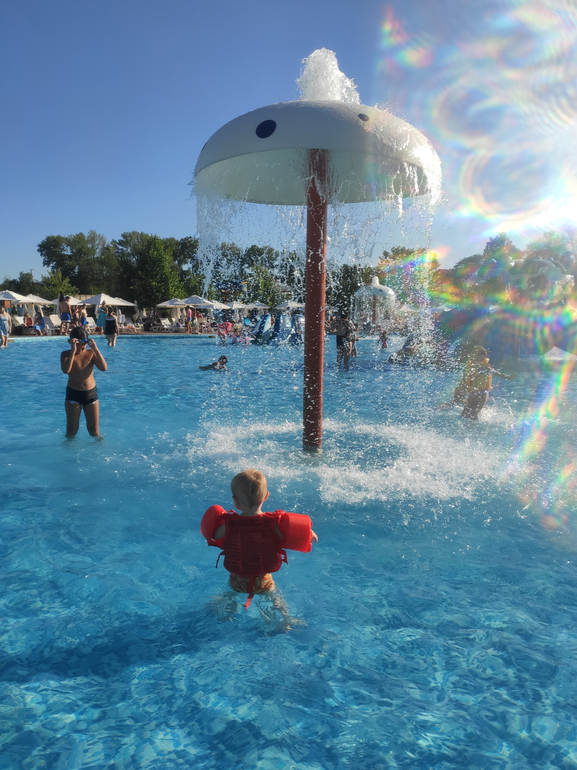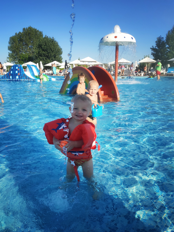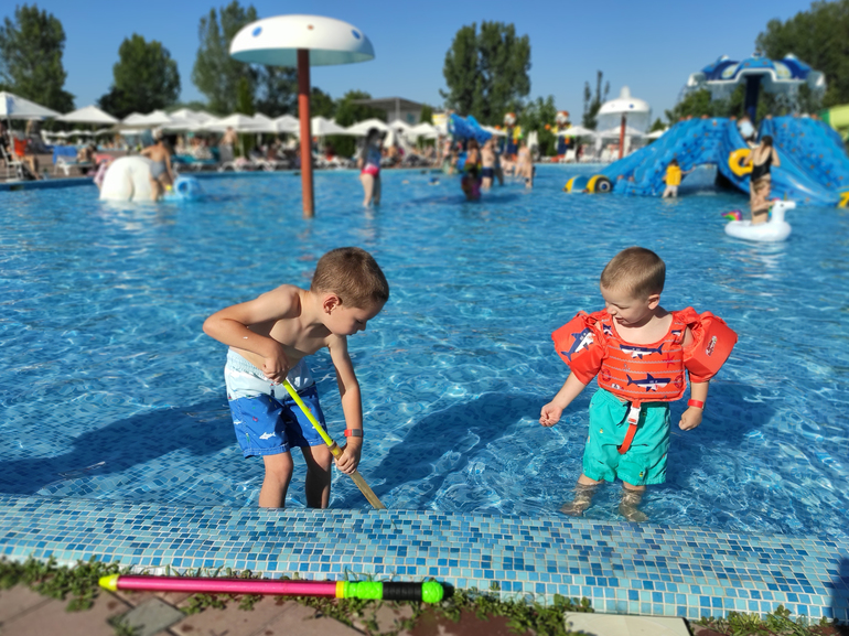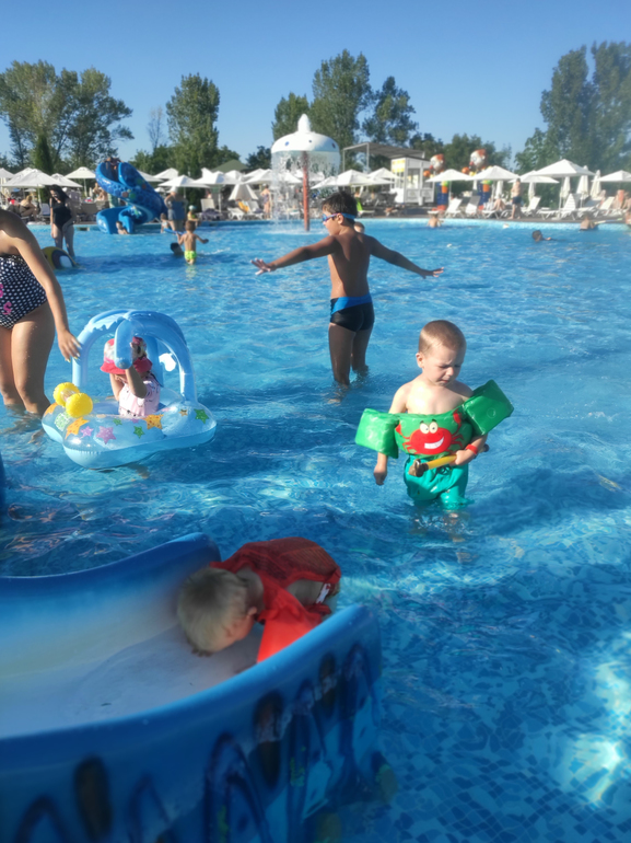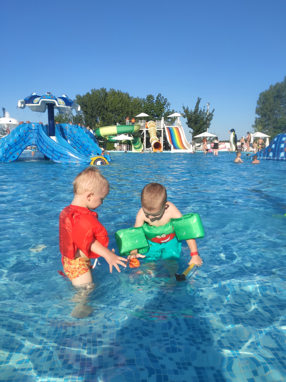 Мишке в целом тоже нормально, не глубоко. Но вот когда он скатывался даже с невысоких горок, умудрялся на секунду уходить под воду и паниковал, поэтому тоже не оставишь одного. Лешка в принципе устойчиво держался на ногах только у берега, но именно у берега ему было совсем неинтересно, и тянуло в центр, а там при каждом втормо шаге бухался в воду.